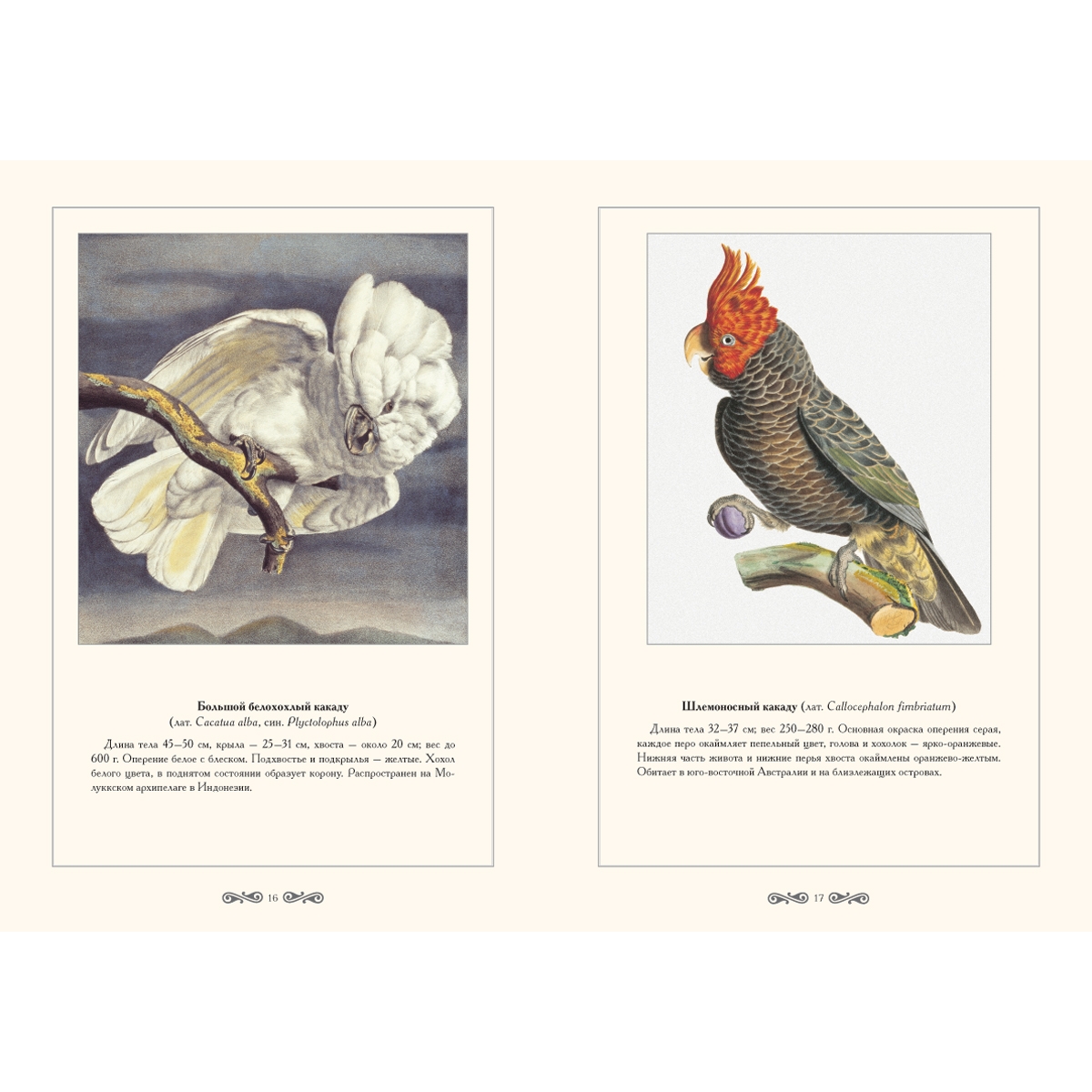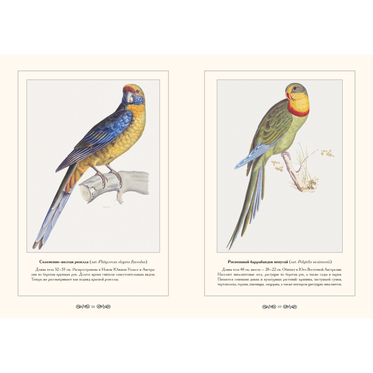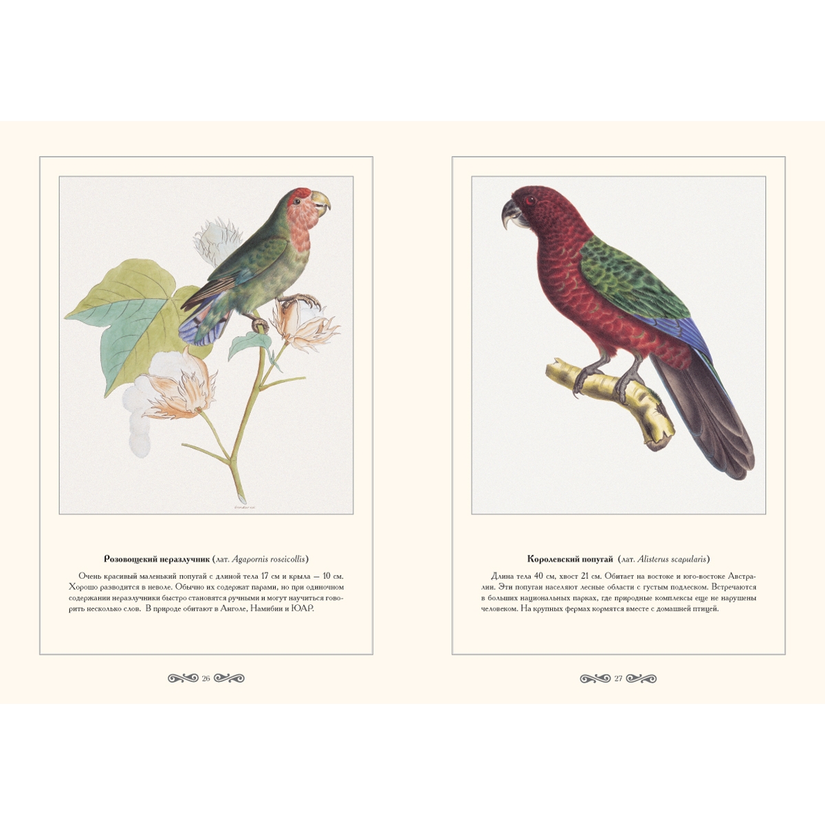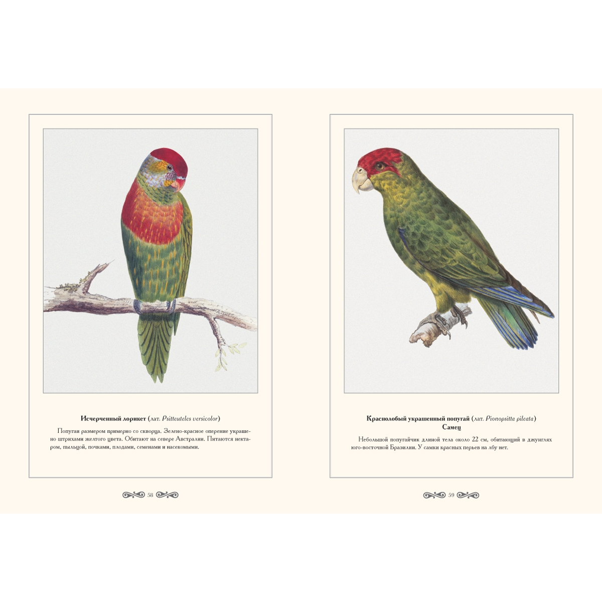 Данный альбом знакомит читателя с собранием из 110 цветных литографий ХIХ века, изображающих попугаев из разных континентов. Литографии служили иллюстрациями научных книг или издавались в виде красочных альбомов в разных странах Европы: в Англии, Франции и др