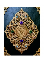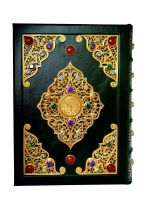 Французский цельнокожаный переплет ручной работы. Натуральная переплетная кожа. Цвет Зеленый. Форзац составной на кожаной слизуре. Дизайнерская бумага. Каптал двойной наборный, ручное плетение из шелковых нитей. Обрез торшонированный золотой фольгой. Ляссе шелковое. Украшение переплета: тиснение полиграфической фольгой. Накладные элементы-позолоченное серебро. Ювелирные вставки: цветные фианиты бриллиантовой огранки, кабашоны. Подарочный футляр. Подарок, достойный эмиров и шейхов. Драгоценное оформление. На каждой странице: изысканная арабская вязь, цветные восточные орнаменты (золото, серебро, печать 4 краски).