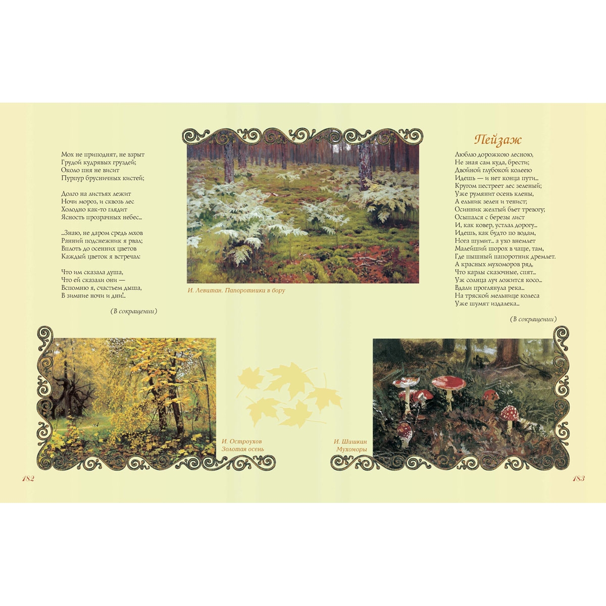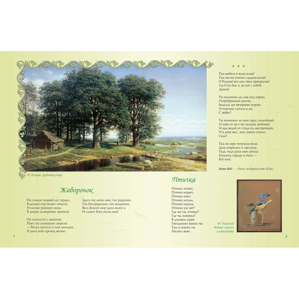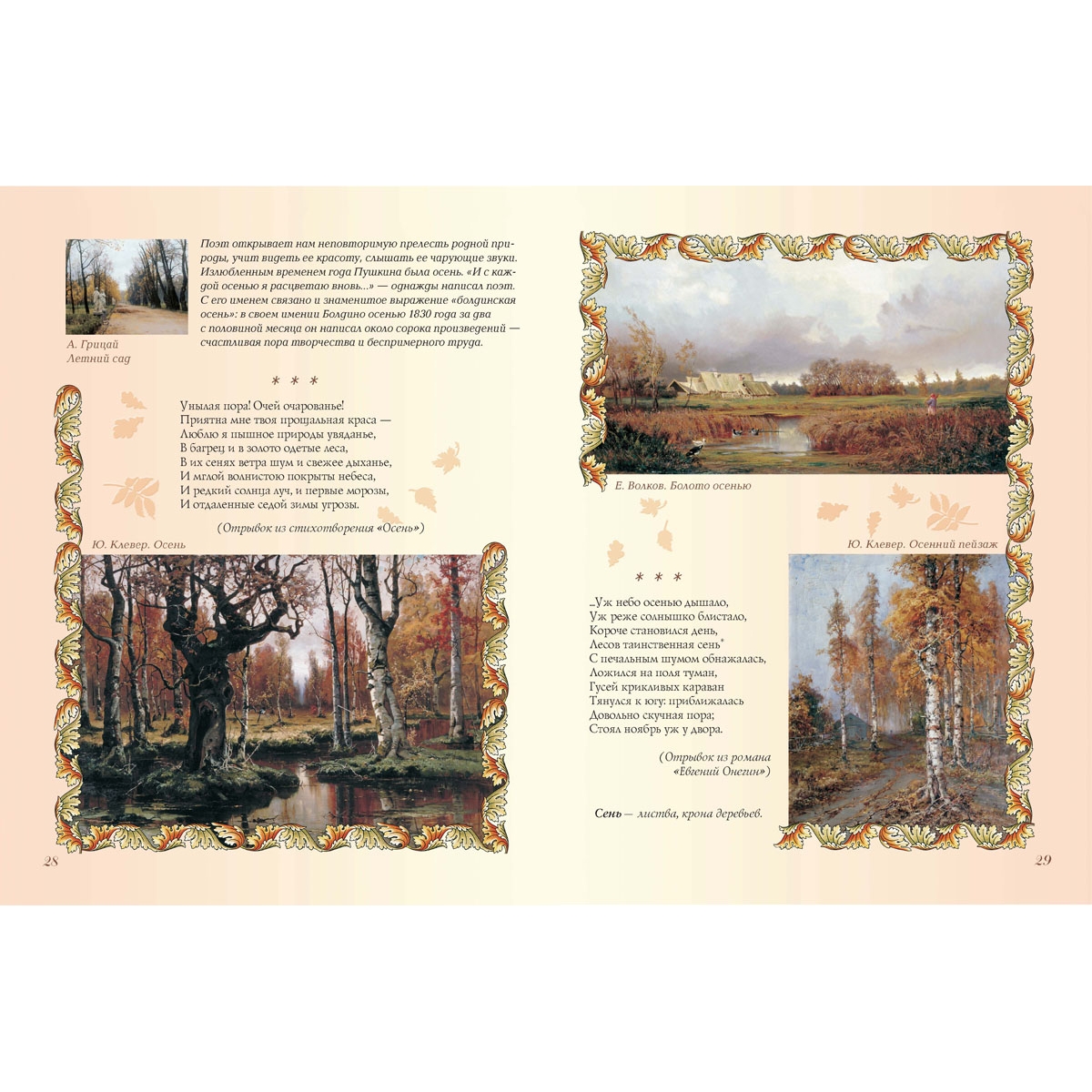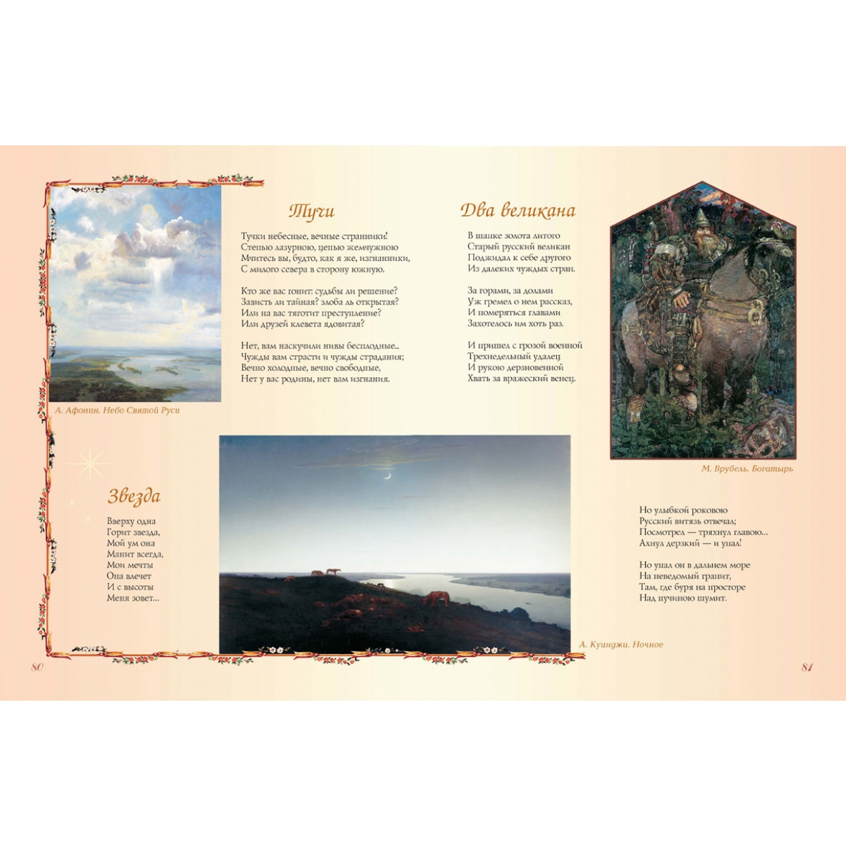 Большинство стихотворений в сборнике – из школьной программы. Такое своеобразное «собрание сочинений» поможет школьникам найти необходимые для обучения литературе поэтические произведения, что называется, «не выходя из дому». Сборник стихов великих русских поэтов сделан с особой тщательностью. В нем максимально учтены интересы наших читателей. Стихи отобраны из собраний сочинений согласно возрасту любителей поэзии, биографии авторов расширят представление ребенка о жизни поэта, поскольку в них уделено внимание детству будущих гениев. Пояснения к тексту, порой расширенные, вводят ребенка в атмосферу далекого времени. Уникально оформление книги. Картины русских художников дают углубленное представление о времени: о нем рассказывают мастера кисти – люди с обостренным восприятием жизни. В книге также использованы интересные оформительские приемы: сложный фон, цветные развороты и проч. Надеемся, что книга украсит домашнюю библиотеку – и в прямом, и переносном смысле.