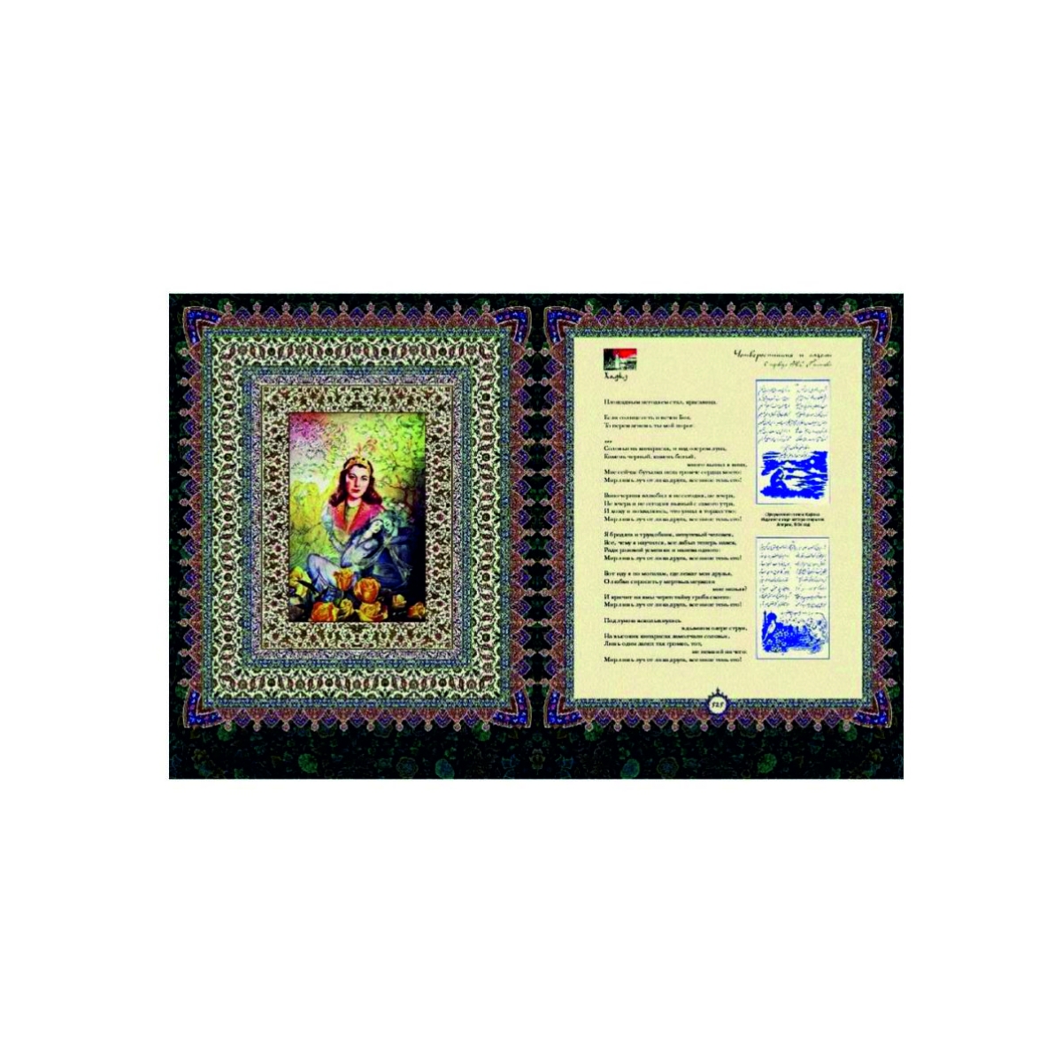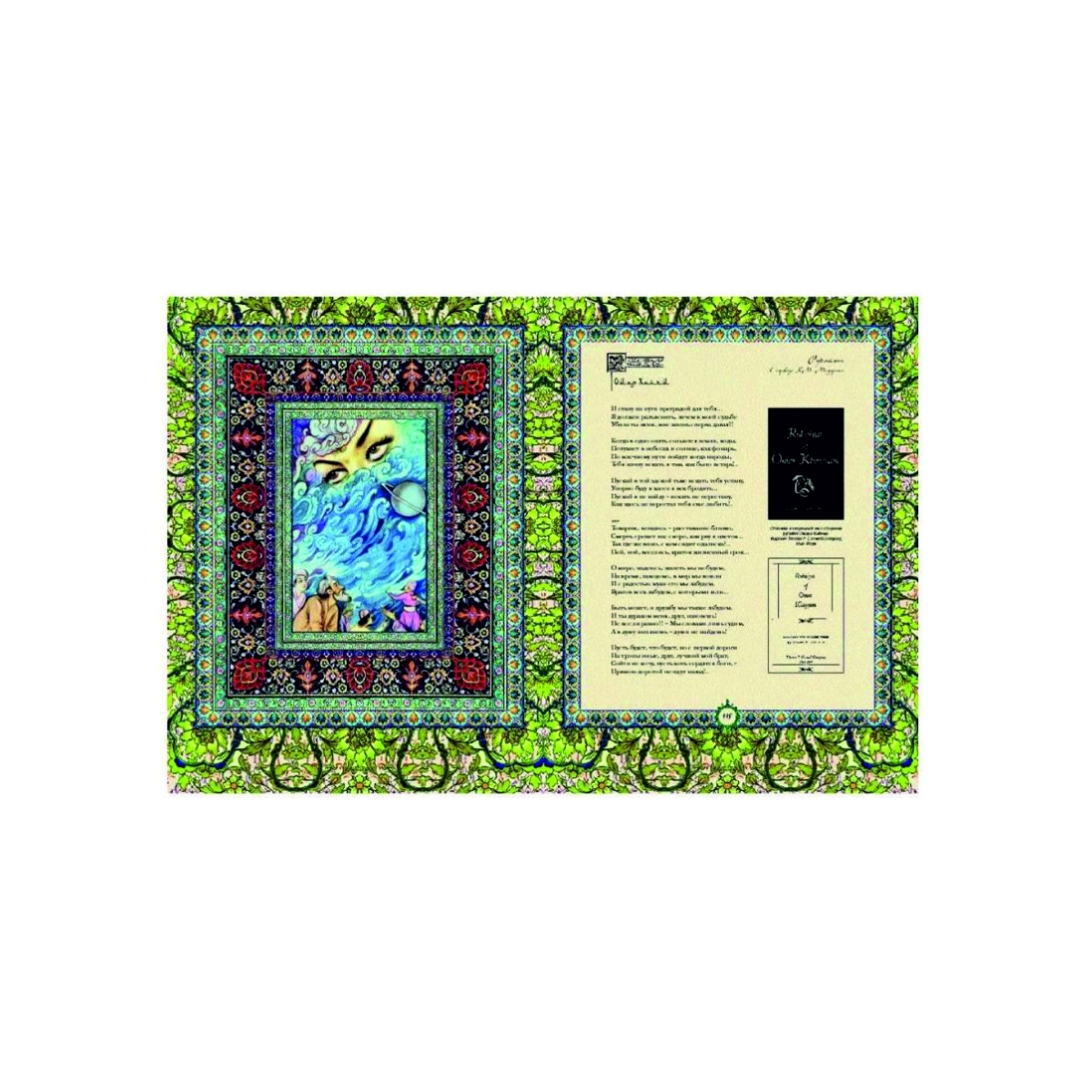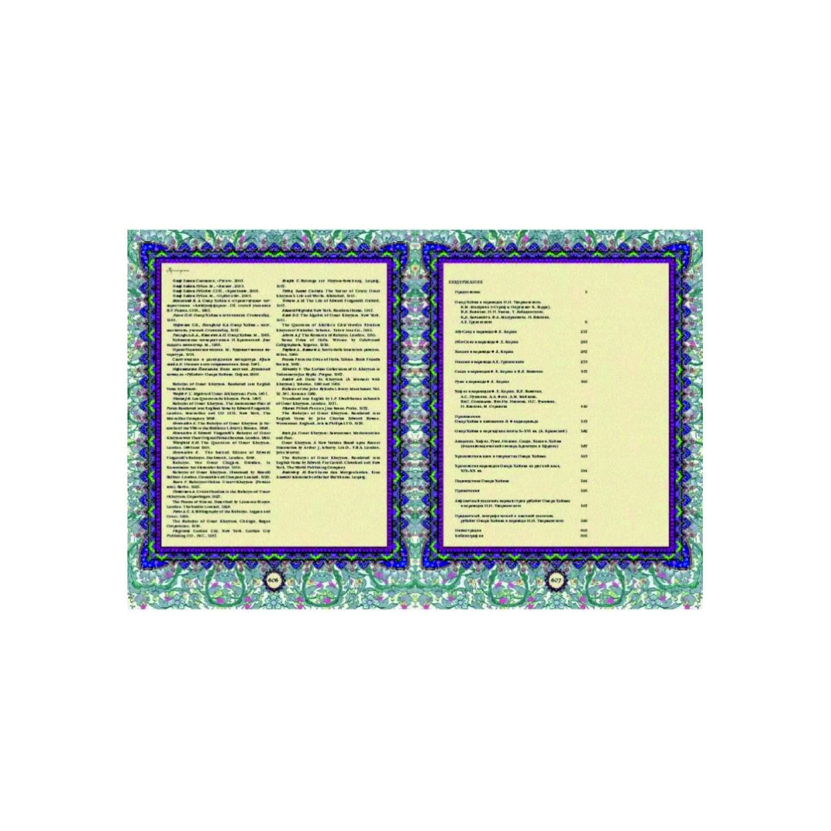 Французский цельнокожаный переплет ручной работы на шнурах. Натуральная переплетная кожа. Цвет Темно-зеленый. Форзац составной на кожаной слизуре. Каптал двойной наборный, ручное плетение из шелковых нитей. Обрез торшонированный золотой фольгой. Ляссе шелковое. Украшение переплета: тиснение полиграфической фольгой. Ювелирные накладки: Художественное литье-латунь, золочение. Ювелирные вставки: натуральные камни, фианиты. Подарочный футляр. «Рубайят» Омара Хайяма – собрание восточной мудрости в переводах И.И. Тхоржевского и прочих известных русских поэтов конца XIX – начала ХХ века. В издание включены в переводах Ф.Э, Корша и других русских поэтов и произведения персидских стихотворцев X–XVI веков: ИбнСины, АбуСеида, Хафиза, Руми, Низами, Саади, Хакани. Стихи сопровождают сотни иллюстраций: Мохаммада Таджвида к «Рубайят» Омара Хайяма и стихам Хафиза, опубликованным в Тегеране в середине ХХ века, лучшие иллюстрации западноевропейских изданий конца XIX – начала ХХ века, персидские миниатюры XV–XIX веков, миниатюры кашмирских рукописей XVIII века. Издание дополнено хронологией жизни и творчества О. Хайяма, переводов Рубаи, примечаниями и указателями.