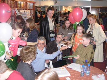 Занимательные викторины оживили атмосферу стенда, дети активно и увлеченно отвечают на вопросы авторов и ведущей. Победители получают в подарок книги с автографами писателей.