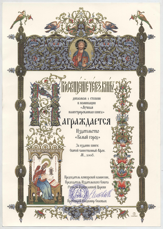 12 ноября 2008 года в центральном выставочном зале «Манеж» состоялась церемония торжественного закрытия ежегодной выставки «Православная Русь», на которой книга издательства «Белый город» «Святой таинственный Афон» была признана «Лучшей иллюстрированной книгой» по итогам конкурса «Просвещение через книгу».