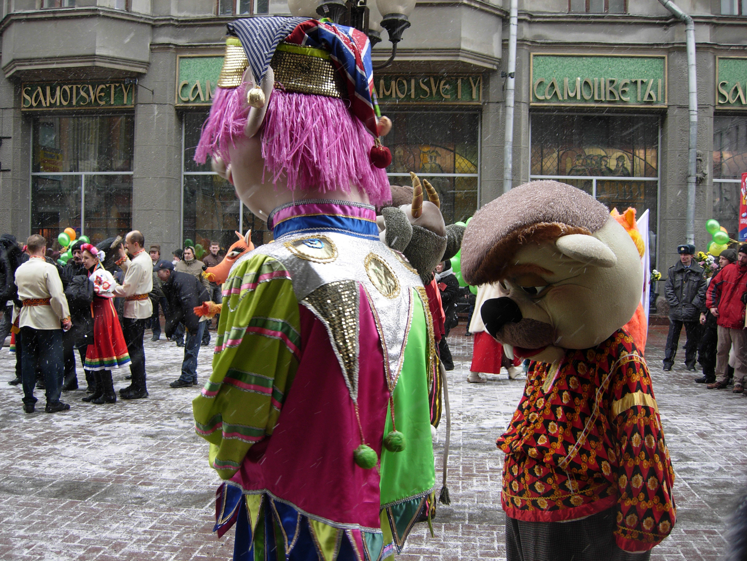 Духовой оркестр, скандирование лозунгов, звуки дудок создавали неповторимую атмосферу праздника, а у театра имени Е.Б. Вахтангова всех ожидало театрализованное представление с участием ростовых кукол и танцевального ансамбля. Дети и их родители охотно приняли участие в этом представлении.