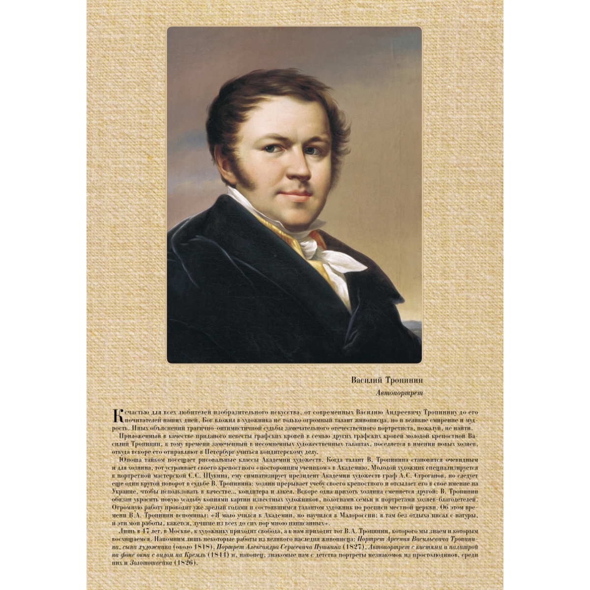 Художник В.А. Тропинин говорил: «Кто же любит в жизни смотреть на сердитые, пасмурные лица?» И писал образы людей, на лицах которых можно прочесть доброту, умиротворенность, любовь к людям. Такова была и его натура – он сочувствовал чужой беде, ценил в людях душевный покой, дорожил каждым мгновением жизни. За свою долгую жизнь, большую часть которой он был крепостным, художник создал немало прекрасных полотен, с которых смотрят на нас купцы, московские дворяне, русские писатели… О портретах сына, кружевницы и Пушкина говорят, что они «сияют, как недосягаемые вершины в его творчестве».