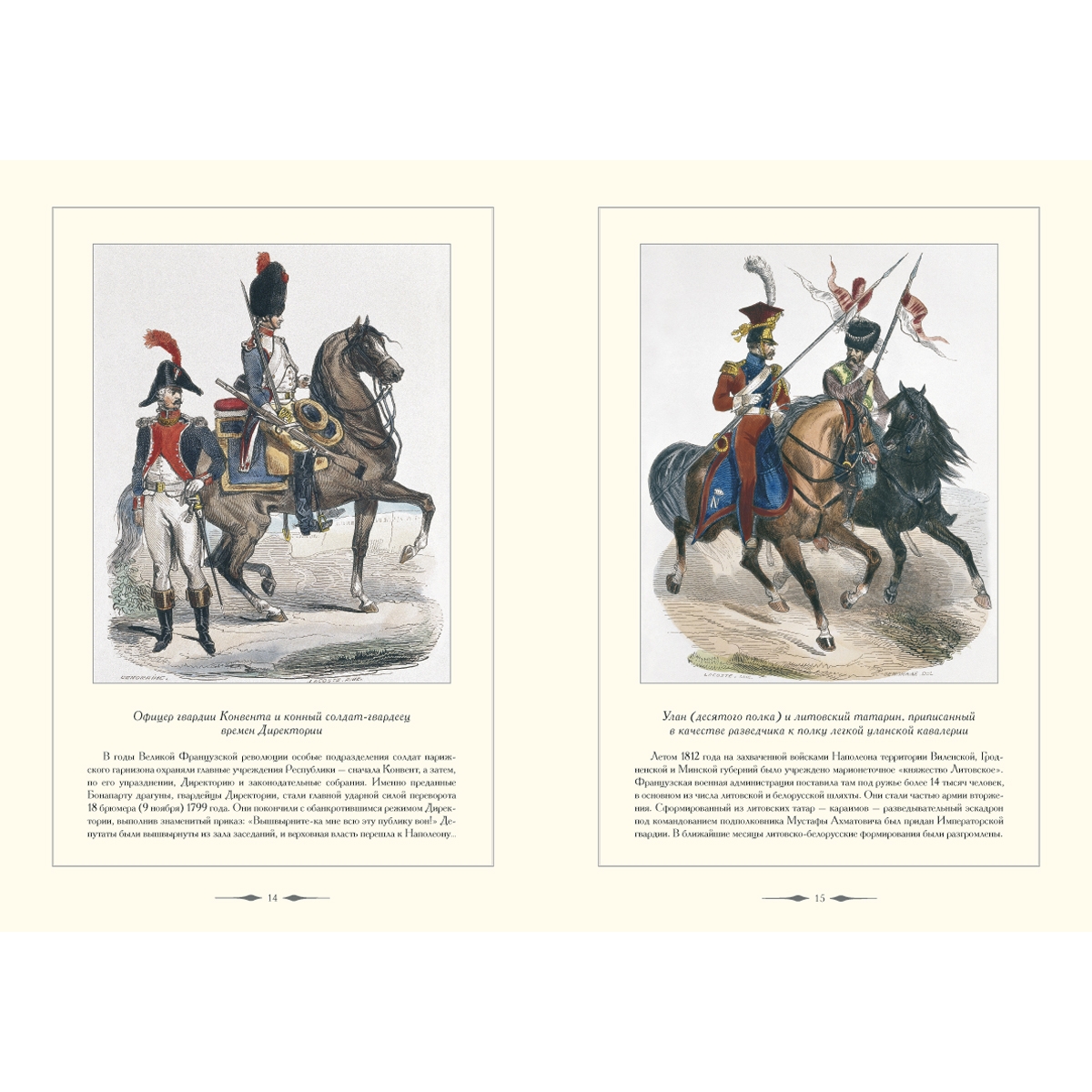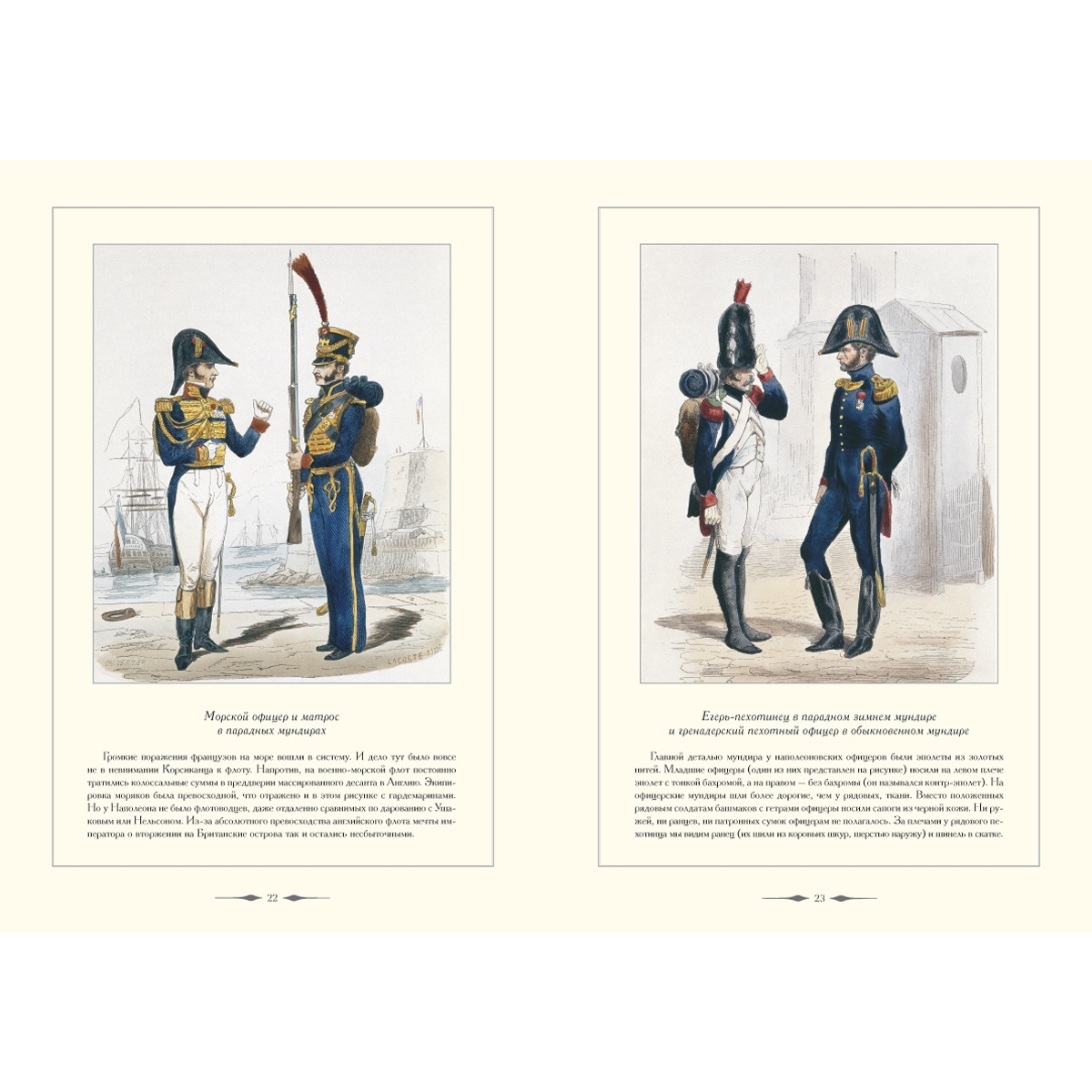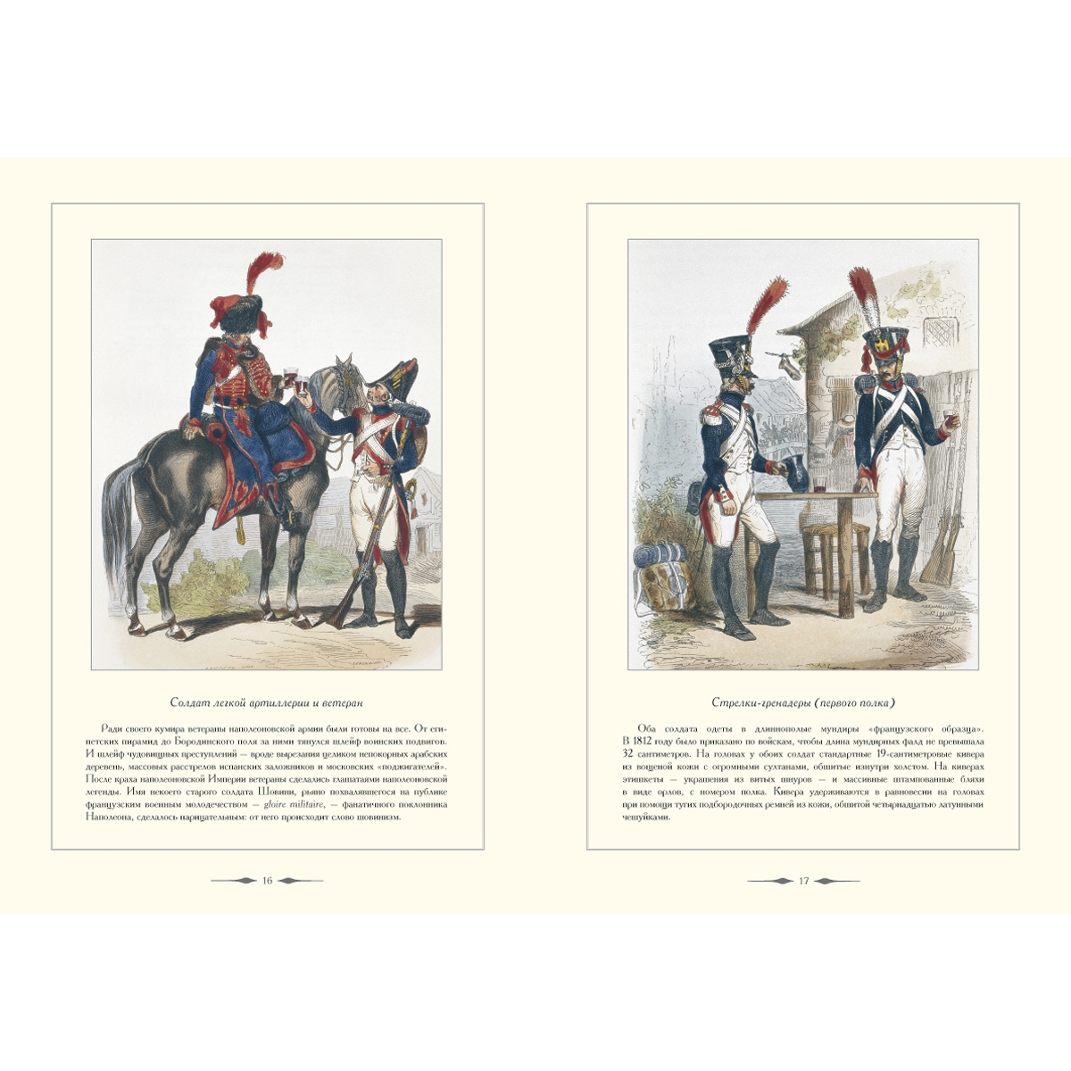 Несколько слов об обмундировании наполеоновских гвардейцев. Оно вело свое происхождение от военной формы солдат революционной Франции. Первоначально солдаты-приверженцы Республики и солдаты-роялисты внешне отличались друг от друга только цветом кокард на треуголках: у первых кокарды были сине-бело-красные, у вторых – под цвет бурбонских геральдических лилий – абсолютно белые. Важной деталью в обмундировании офицеров-республиканцев были трехцветные кушаки. В ходе многочисленных войн, которые вела Французская республика, запасы обмундирования, пошитого еще при Людовике XVI, быстро оказались изношенными. Уже во время Итальянского похода 1797 года солдаты генерала Бонапарта воевали в обносках и без сапог. С его приходом к власти вновь пошитые мундиры варьируют предшествующие образцы. Регламент, составленный полковником Барденом и утвержденный императором 19 января 1812 года, четко определил порядок ношения военной формы и ее покрой для всех частей наполеоновской армии. Все было расписано до мелочей. Однако отступления от регламента продолжались вплоть до самого конца наполеоновской Империи. Невозможно было в один момент провести реформу обмундирования в самой большой в мире армии, раскинутой по всей континентальной Европе. Сыграл свою роль и «человеческий фактор» – дух вольницы, неистребимый с революционных времен. Тон здесь задавал лучший кавалерист Европы любимец Наполеона маршал Мюрат, щеголявший на полях сражений в пышных фантастических одеяниях. Глядя на него, наполеоновские офицеры, в том числе и гвардейцы, нет-нет, да и позволяли себе живописные вольности в одежде и экипировке. Другой наполеоновский лейтенант, Бургуэн из штаба генерала Делаборда, писал, вспоминая солдат 1812 года: «Полковники имели большую склонность изменять регламентированную униформу, отчего происходила пестрота… она придавала каждой части свое лицо, сразу запоминавшееся и помогавшее узнать ее издали».