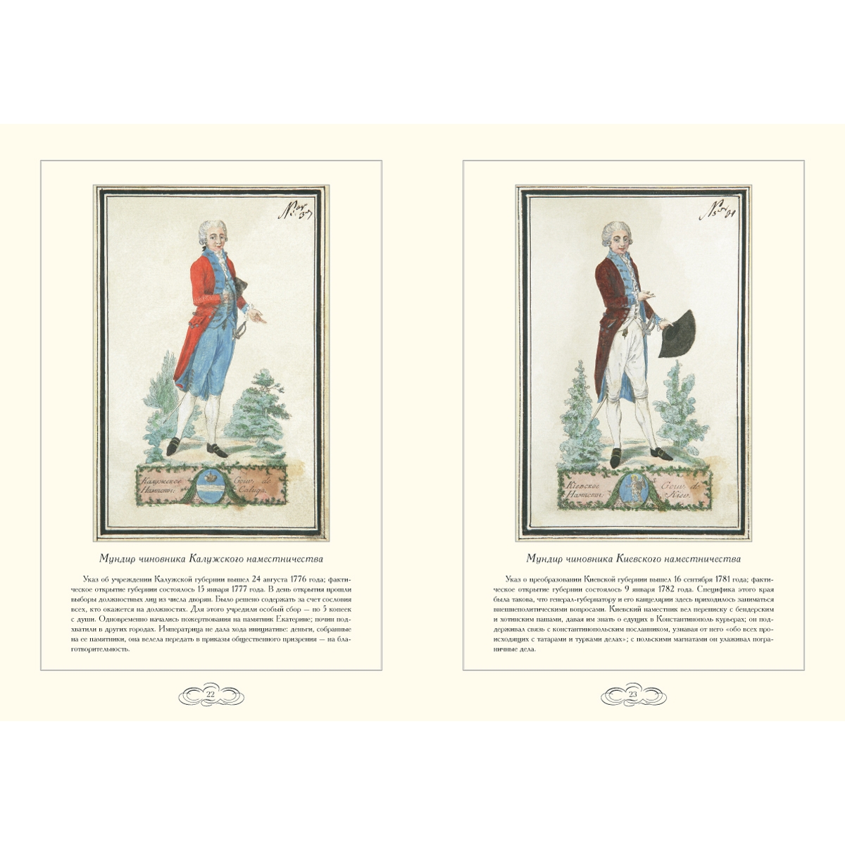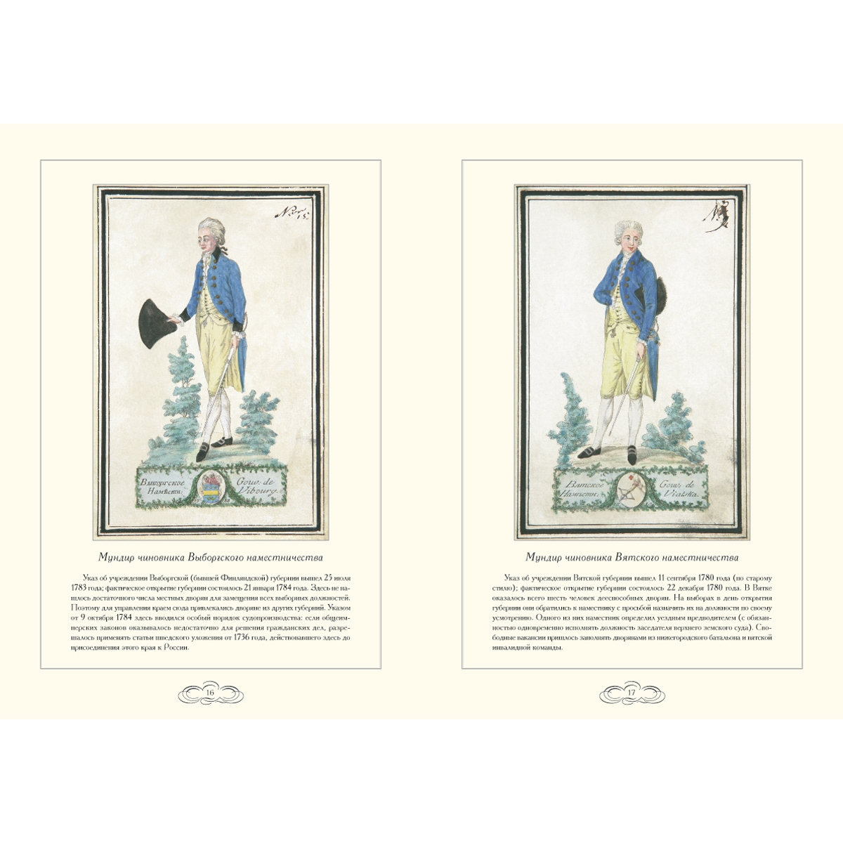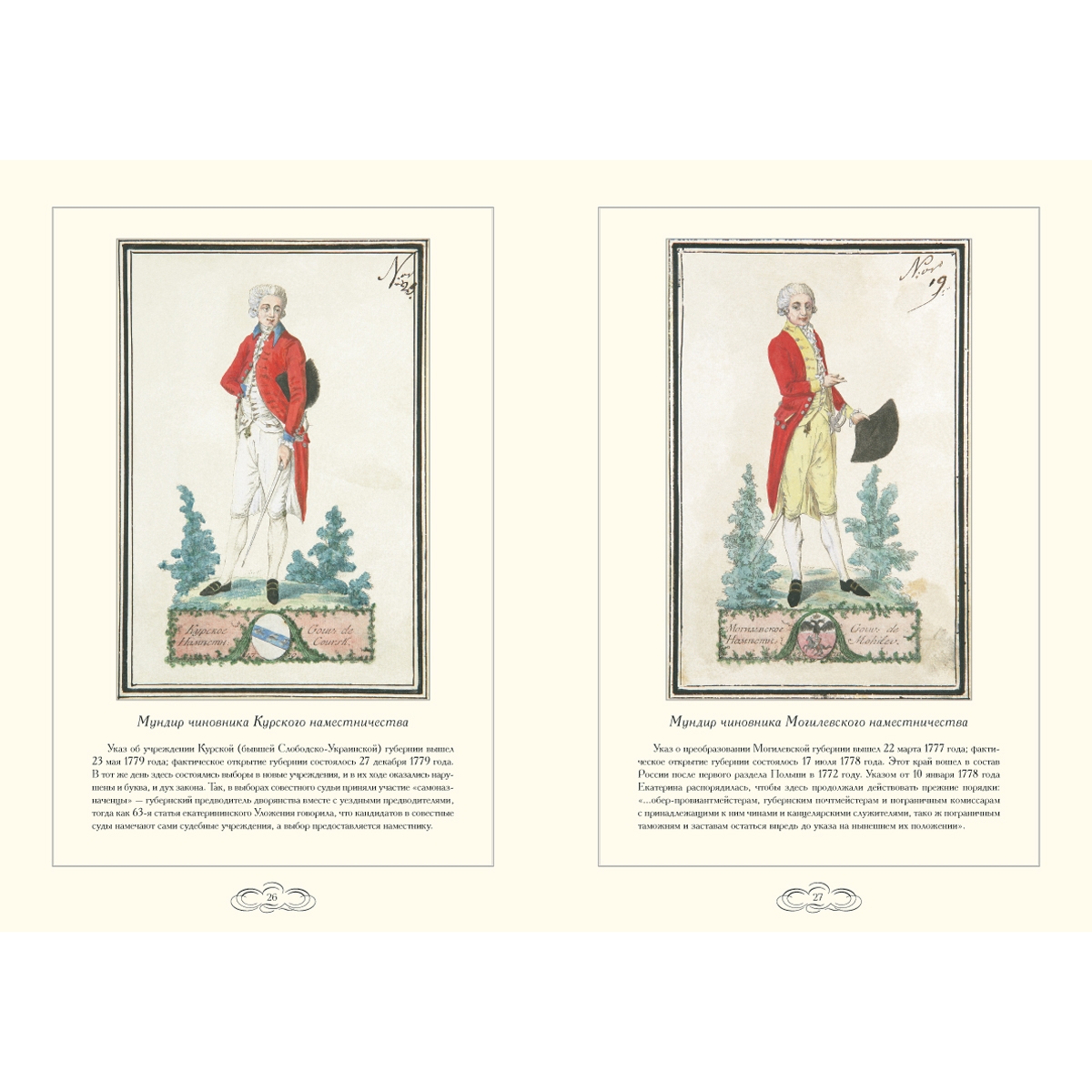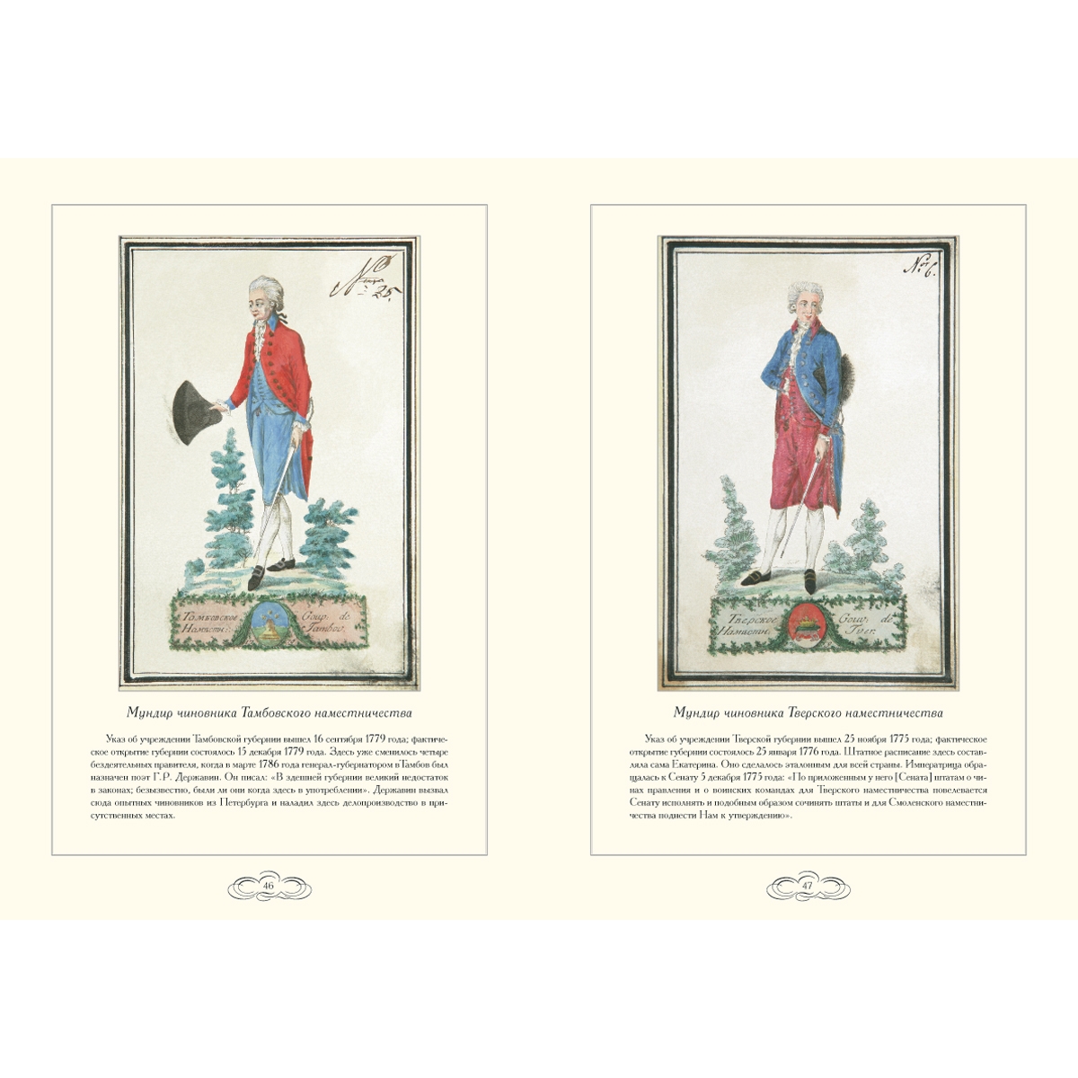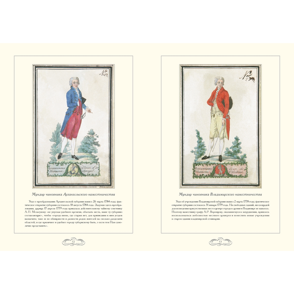 В 1775 году Екатериной II был издан указ о разделении территории Российской империи на губернии. Спустя несколько лет были введены особые мундиры для губернских чиновников, образцы которых представлены в данном издании.