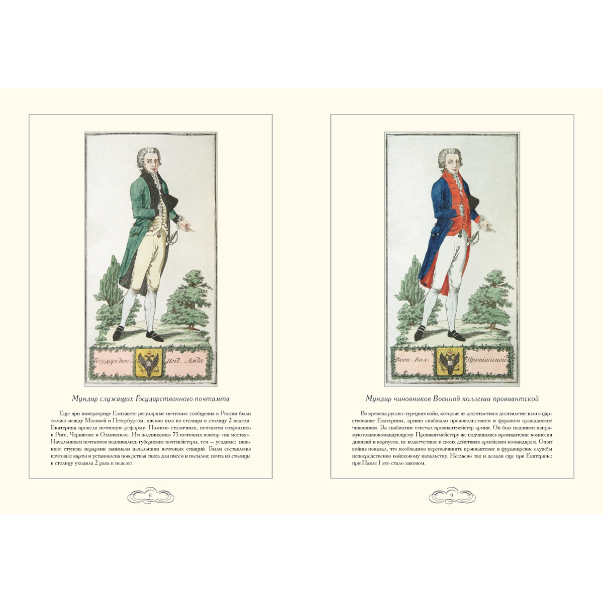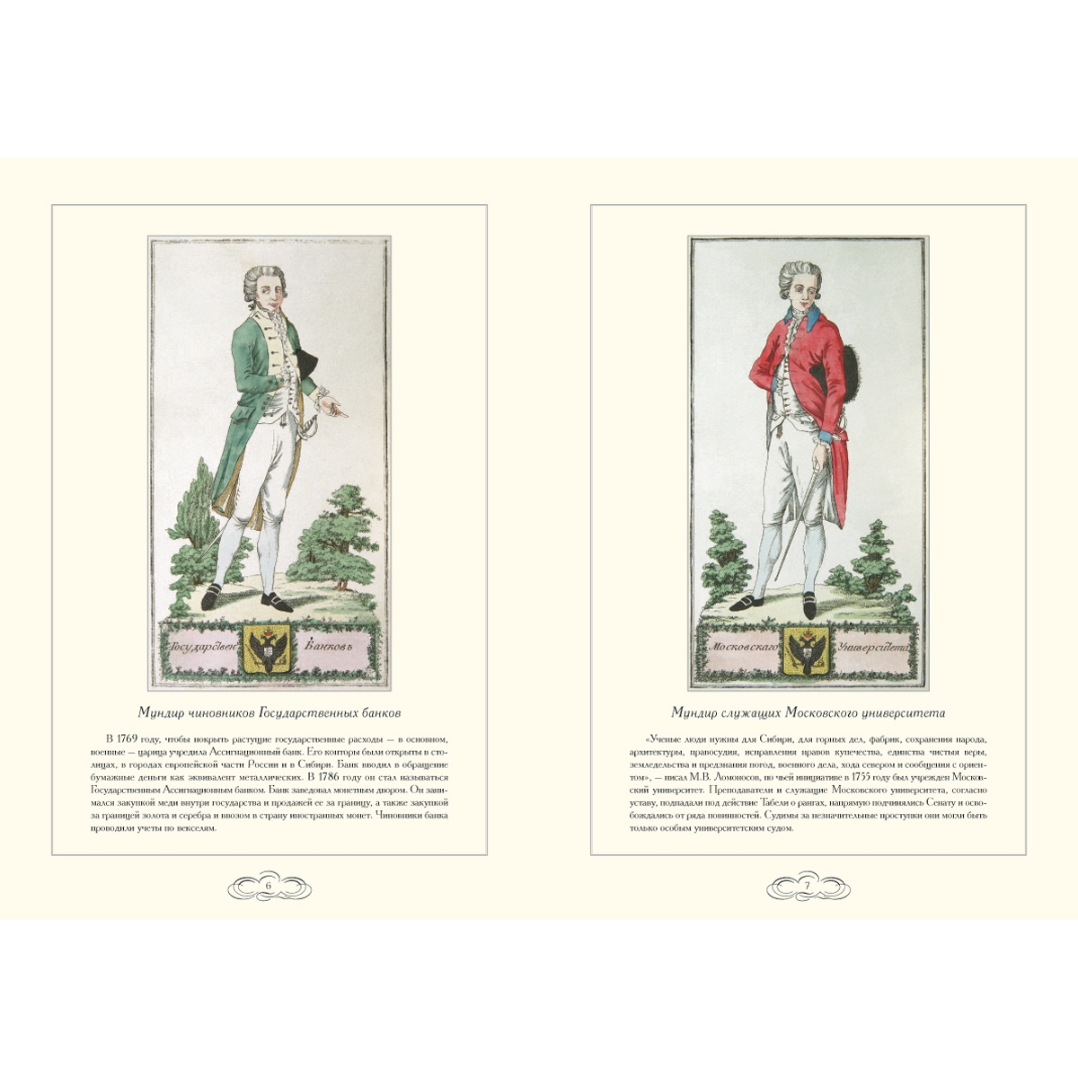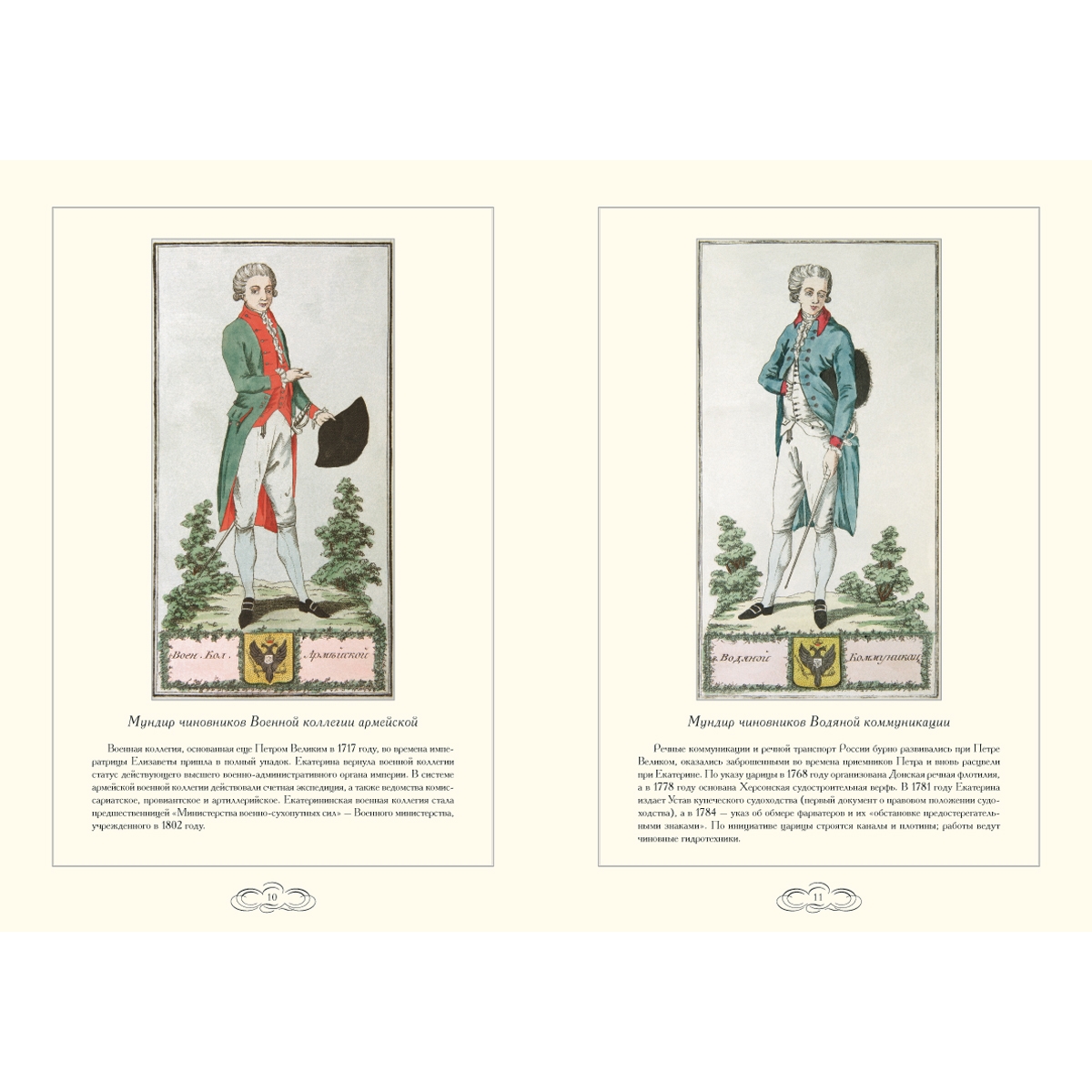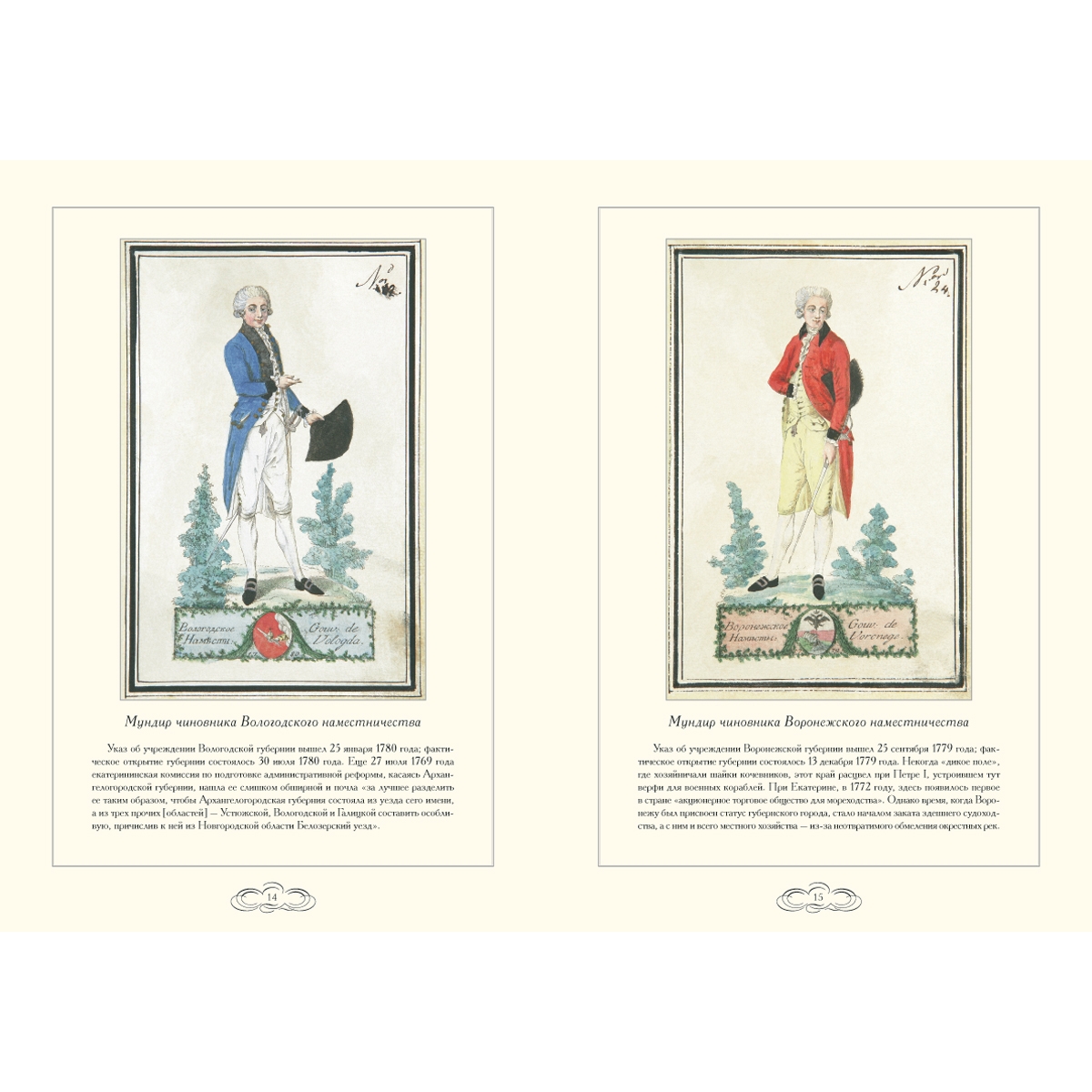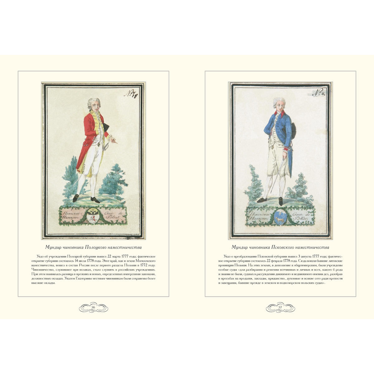 В 1775 году Екатериной II был издан указ о разделении территории Российской империи на губернии. Спустя несколько лет были введены особые мундиры для губернских чиновников, образцы которых представлены в данном издании.