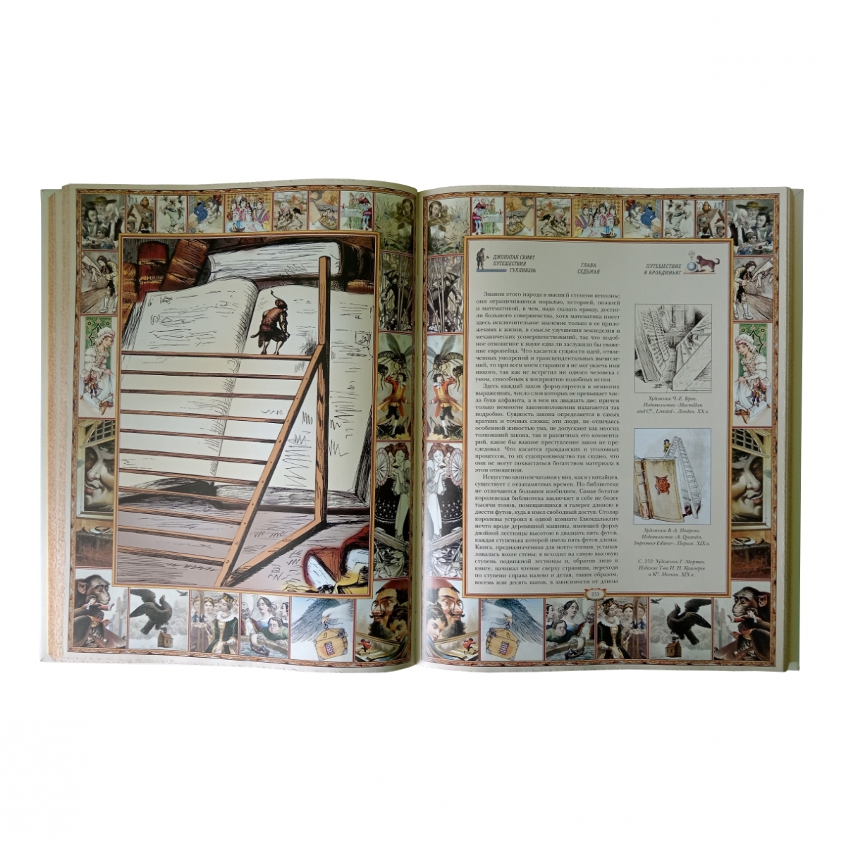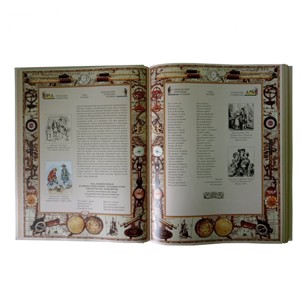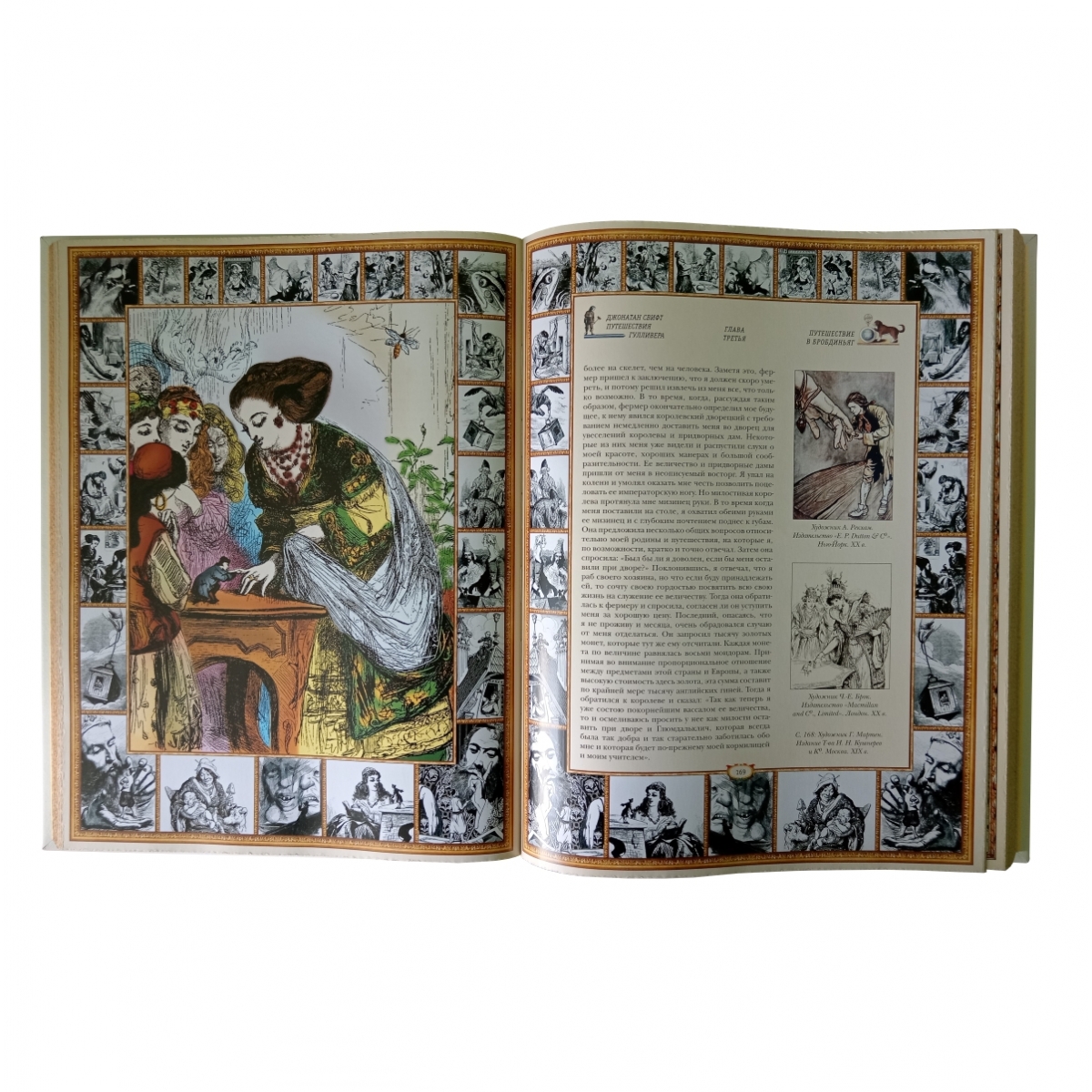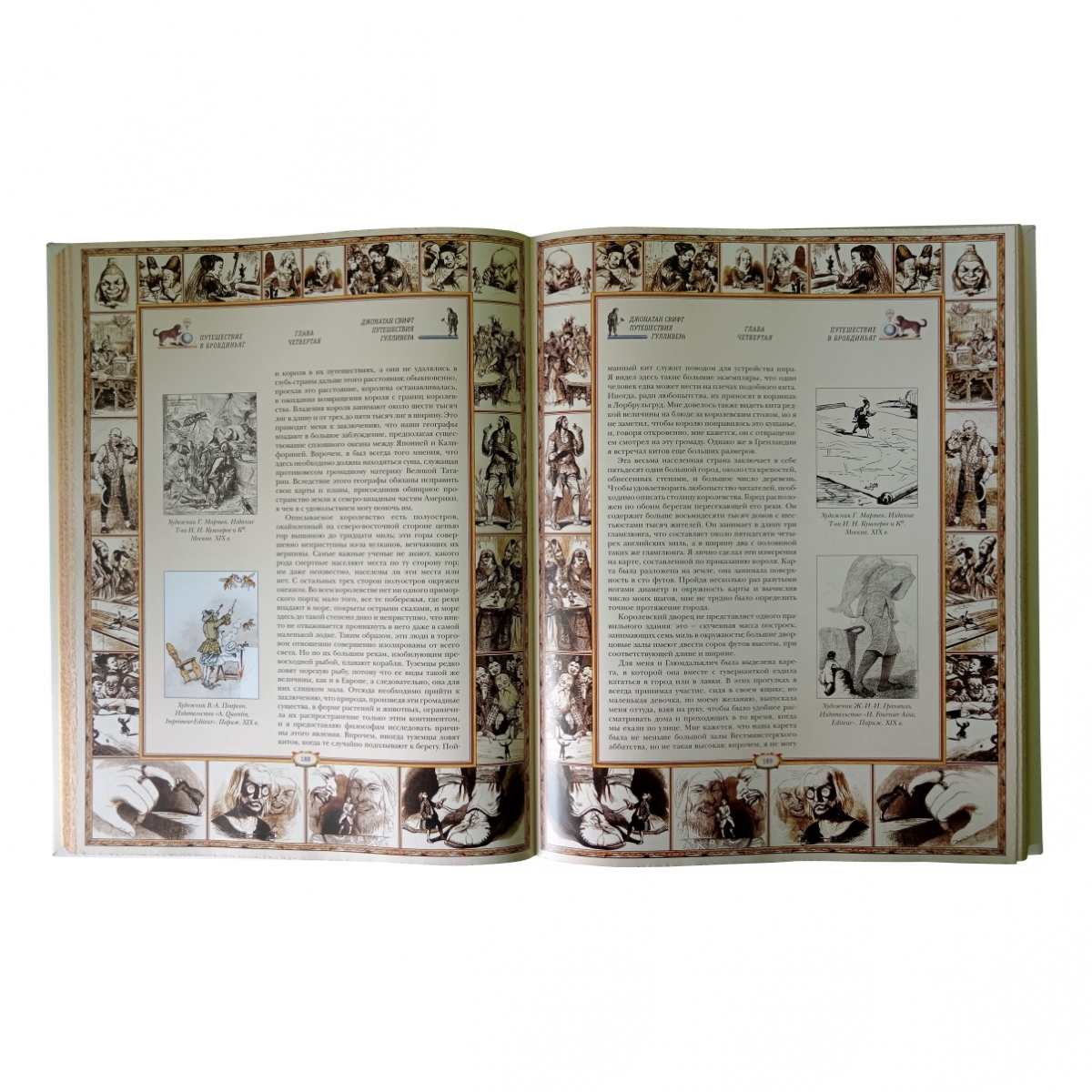 Издание романа Джонатана Свифта «Путешествия Гулливера», подготовленное по принципам серии «Памятники мировой культуры». Переплет ручной работы. Натуральная переплетная кожа. Каптал из шелковых нитей. Ляссе шелковое. Обрез торшонированный золотой фольгой. Украшение переплета: тиснение полиграфической фольгой, печать на коже сольвентными чернилами.