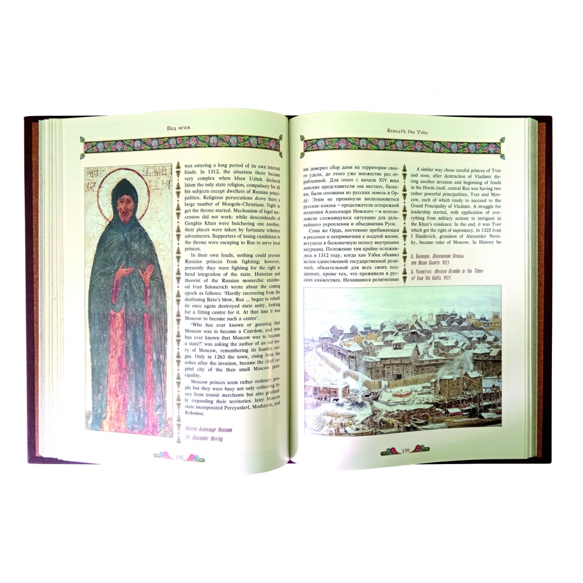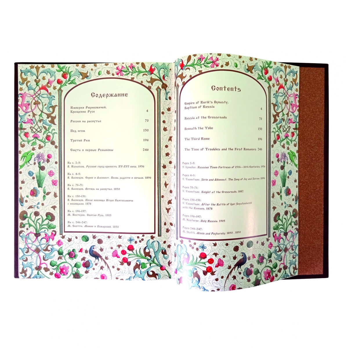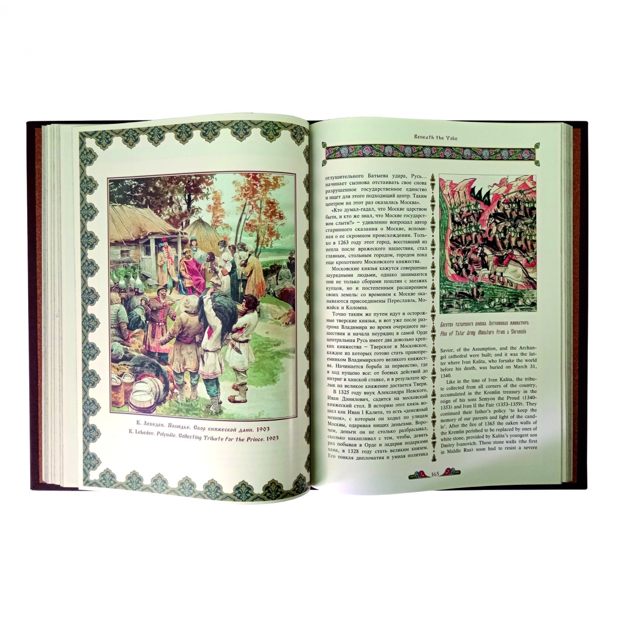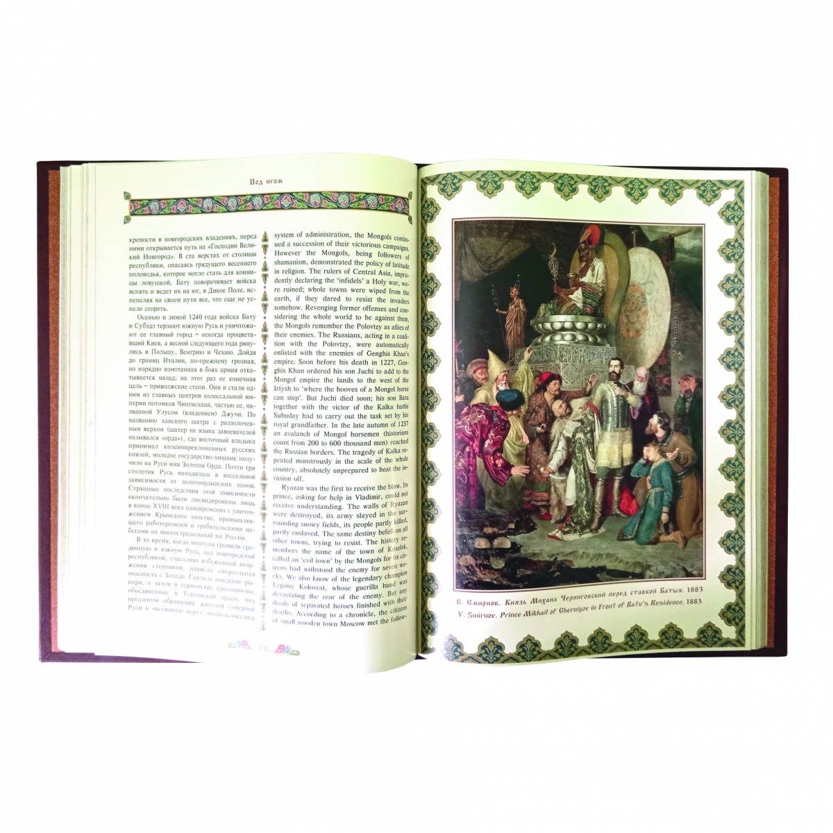 Книга первая часть прекрасно иллюстрированного повествования об истории нашей страны от времен прежде призвания варягов до начала эпохи Петра Великого. Великолепные репродукции произведений искусства, гравюры, артефакты ушедших эпох, полиграфия высшего качества и параллельные тексты на русском и английском языках делают книгу прекрасным подарком. Переплет ручной работы. Натуральная переплетная кожа. Каптал из шелковых нитей. Ляссе шелковое. Обрез окрашенный. Украшение переплета: тиснение полиграфической фольгой, конгревное тиснение.