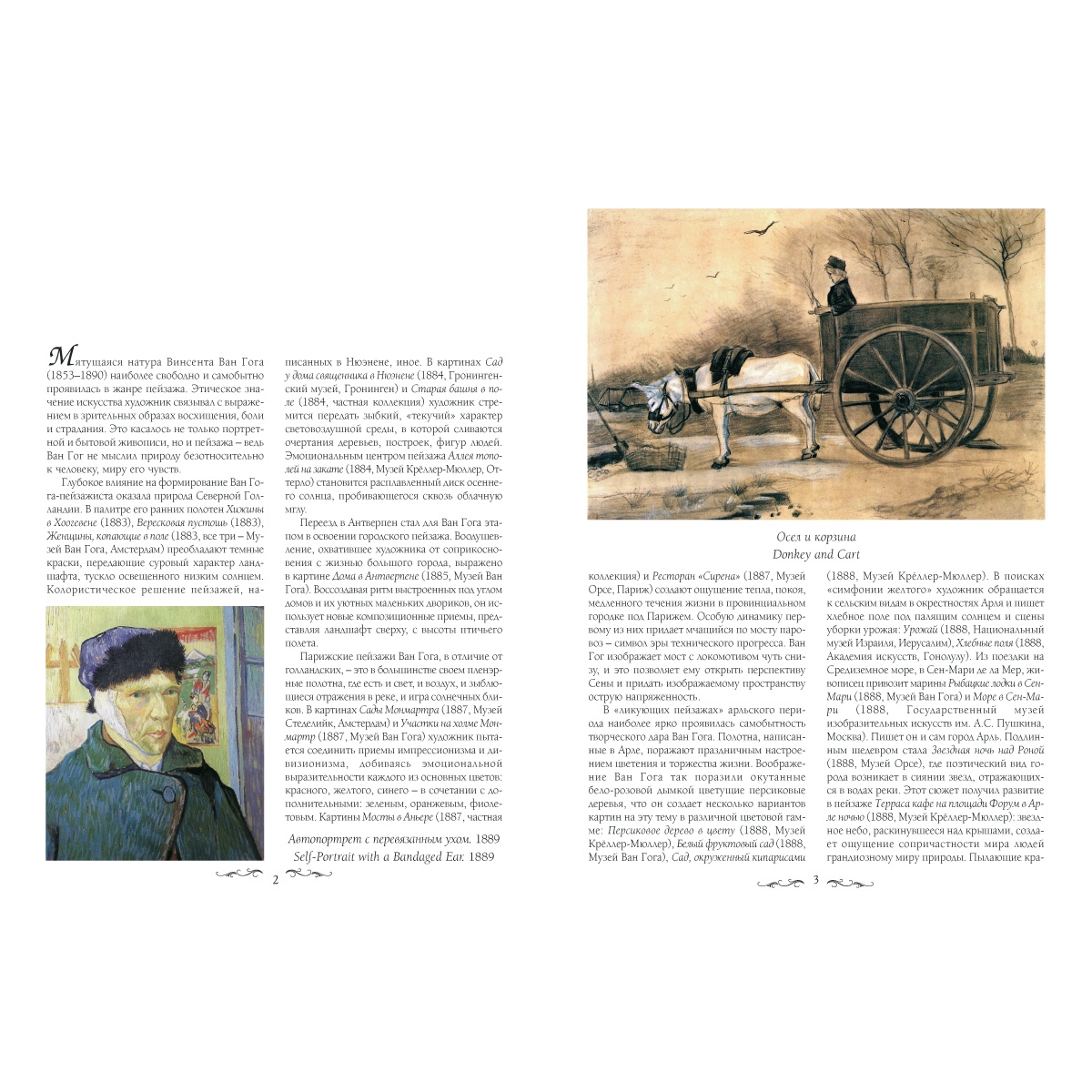 Альбом знакомит читателя с пейзажной живописью Винсента Ван Гога (1853–1890). Этическое значение искусства живописец связывал с выражением в зрительных образах восхищения, боли и страдания. Это касалось и пейзажного жанра – ведь Ван Гог не мыслил природу безотносительно к человеку, миру его чувств. Глубокое влияние на формирование Ван Гога-пейзажиста оказала природа Северной Голландии. В палитре его ранних полотен преобладают темные краски, передающие суровый характер ландшафта, тускло освещенного низким солнцем. Парижские пейзажи художника – это в большинстве своем пленэрные полотна, где есть и свет, и воздух, и зыблющиеся отражения в реке, и игра солнечных бликов. В ликующих пейзажах арльского периода наиболее ярко проявилась самобытность творческого дара Ван Гога. Полотна, написанные в Арле, поражают праздничным настроением цветения и торжества жизни. Драматические пейзажи Ван Гога принадлежат периоду Сен-Реми и Овера. Их устойчивые мотивы – искривленные стволы деревьев, раскидистые кроны, почти закрывающие небо, вздымающаяся буграми коричневая земля, кипарисы – символы смерти и оливы – метафоры жизни.