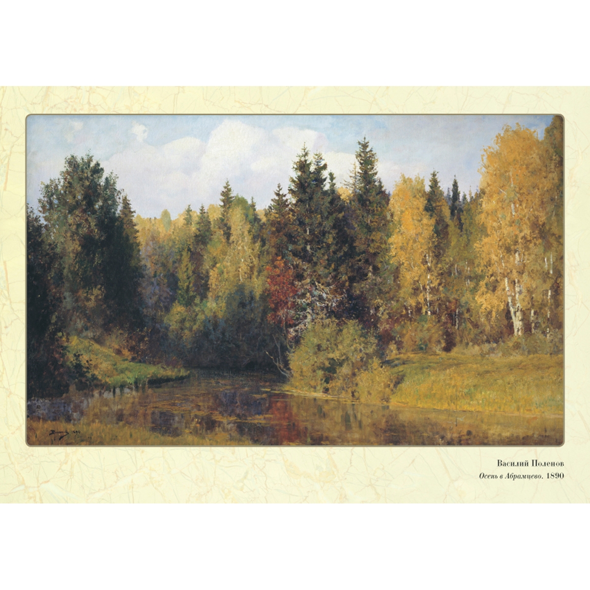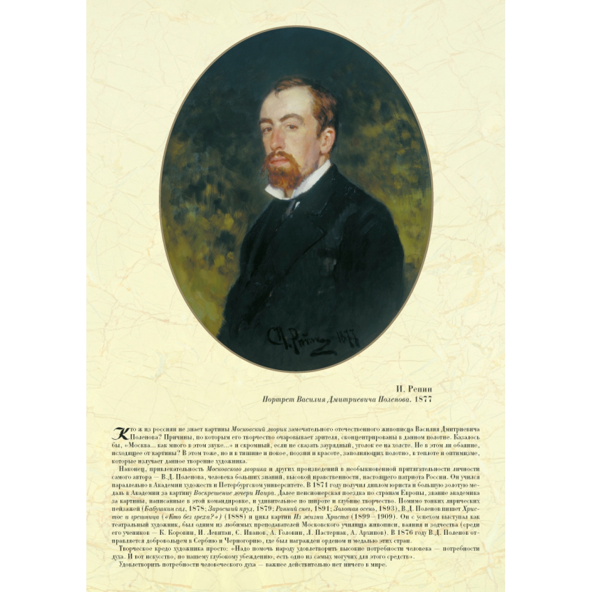 Василий Дмитриевич Поленов (1844–1927) с детства воспитывался в атмосфере высокой культуры. Широк был круг его интересов: он слушал лекции по анатомии, юриспруденции, учился в Академии художеств. Поленов стал живописцем, архитектором, театральным художником, педагогом и даже музыкантом. Он писал жанровые картины, стал автором цикла картин на библейские темы. Но больше всего он любил писать пейзажи. Они и прославили художника. Полные поэзии и лиризма, они стали своего рода эталоном русского пейзажа. Художник говорил, что «…искусство должно давать счастье и радость, иначе оно ничего не стоит». И всю жизнь придерживался этого творческого принципа.