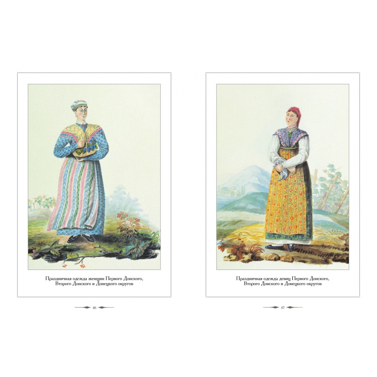 Чтобы подчеркнуть особый – военно-служилый – характер казачьего сословия, законом (чьим инициатором выступил Николай I, страстный любитель вносить всякого рода изменения в покрой и детали мундиров, в том числе и в покрой и детали платьев придворных фрейлин, служанок и кормилиц) была регламентирована также одежда донских казачек, праздничная и повседневная. Ее образцы также представлены в альбоме. Текст части подписей к иллюстрациям взят из составленной В.Д. Смирновым «Справочной книжки Императорской главной квартиры “Казачьи войска”» (СПб, 1912).