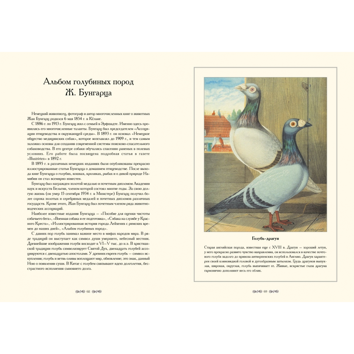 Голубь – птица, издревле существовавшая рядом с человеком. Интерес к истории этой птицы, к разнообразию пород уже в XIX в. стал огромным. В этот альбом включены изображения голубей из книги, выпущенной издательством Г.Ф. Рихтера, и дополнено иллюстрациями немецкого живописца и фотографа Жана Бунгарца.