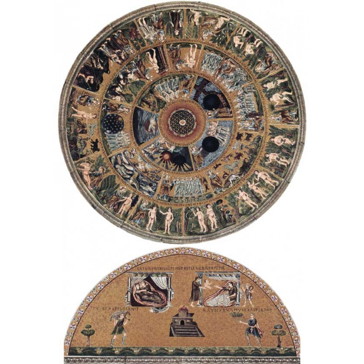 15. Мозаичный купол «Сотворение мира» в атриуме собора. Внизу: восточный люнет со сценами рождения детей у Адама и Евы и фигуры Авеля и Каина, несущих дары к храму
