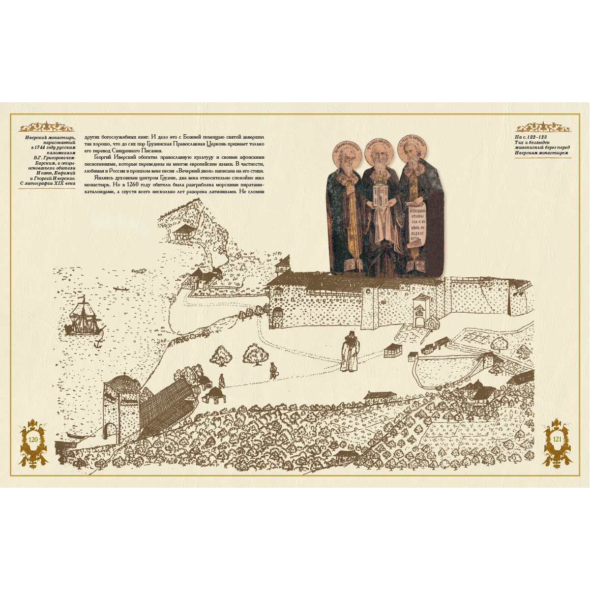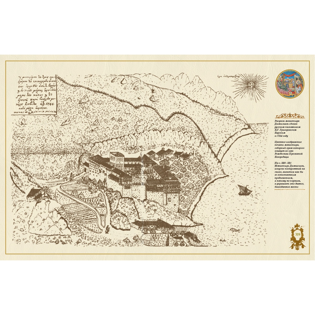 В книге много старинных, никогда ранее не публиковавшихся у нас гравюр и фотографий XIX века о жизни монахов на Афоне. Учитывая, что Г. Юдин и С. Попов (второй фотограф книги) – профессиональные художники, их фотографии отличаются благородством, изысканностью цвета, классичностью композиции, что превращает фотографии в живописные картины, написанные в этом святом, благословенном месте.