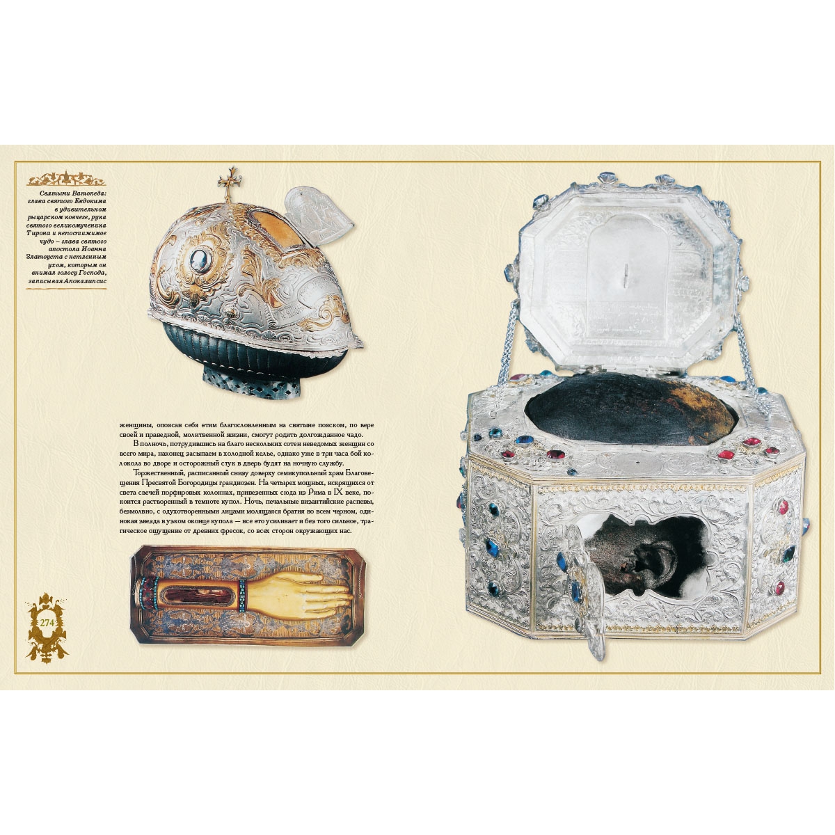 Уникальность этой книги по отношению к другим книгам об Афоне заключается в том, что автор получил разрешение на съемку не только в самих монастырях, что обычно запрещено, но и на съемку редчайших православных святынь, хранящихся в них. Это и глава Андрея Первозванного, рука Марии Магдалины, поясок Богородицы, чудотворные иконы, фрески и кельи святогорских святых, включая особо любимого в России старца Паисия. Переплет ручной работы. Натуральная переплетная кожа. Каптал из шелковых нитей. Ляссе шелковое. Обрез торшонированный золотой фольгой. Украшение переплета: тиснение полиграфической фольгой, блинтовое тиснение.