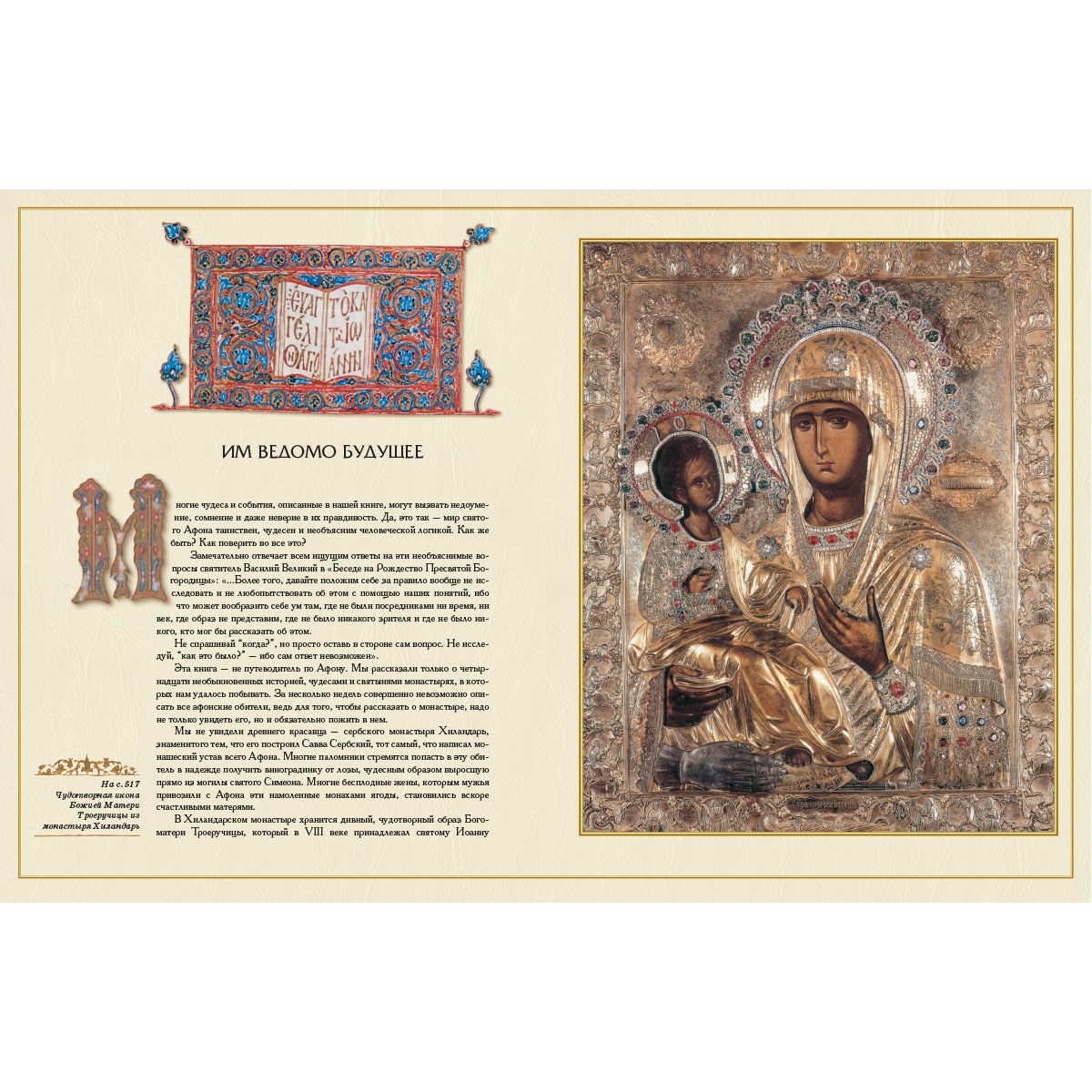 Уникальность этой книги по отношению к другим книгам об Афоне заключается в том, что автор получил разрешение на съемку не только в самих монастырях, что обычно запрещено, но и на съемку редчайших православных святынь, хранящихся в них. Это и глава Андрея Первозванного, рука Марии Магдалины, поясок Богородицы, чудотворные иконы, фрески и кельи святогорских святых, включая особо любимого в России старца Паисия.