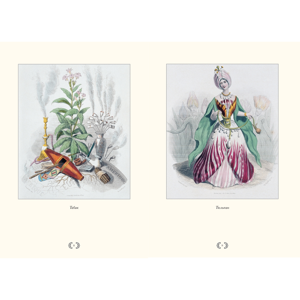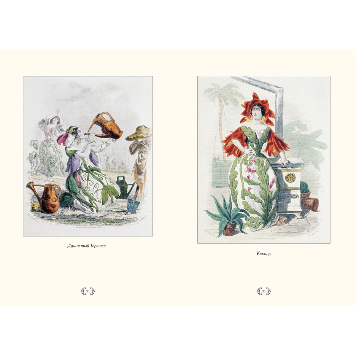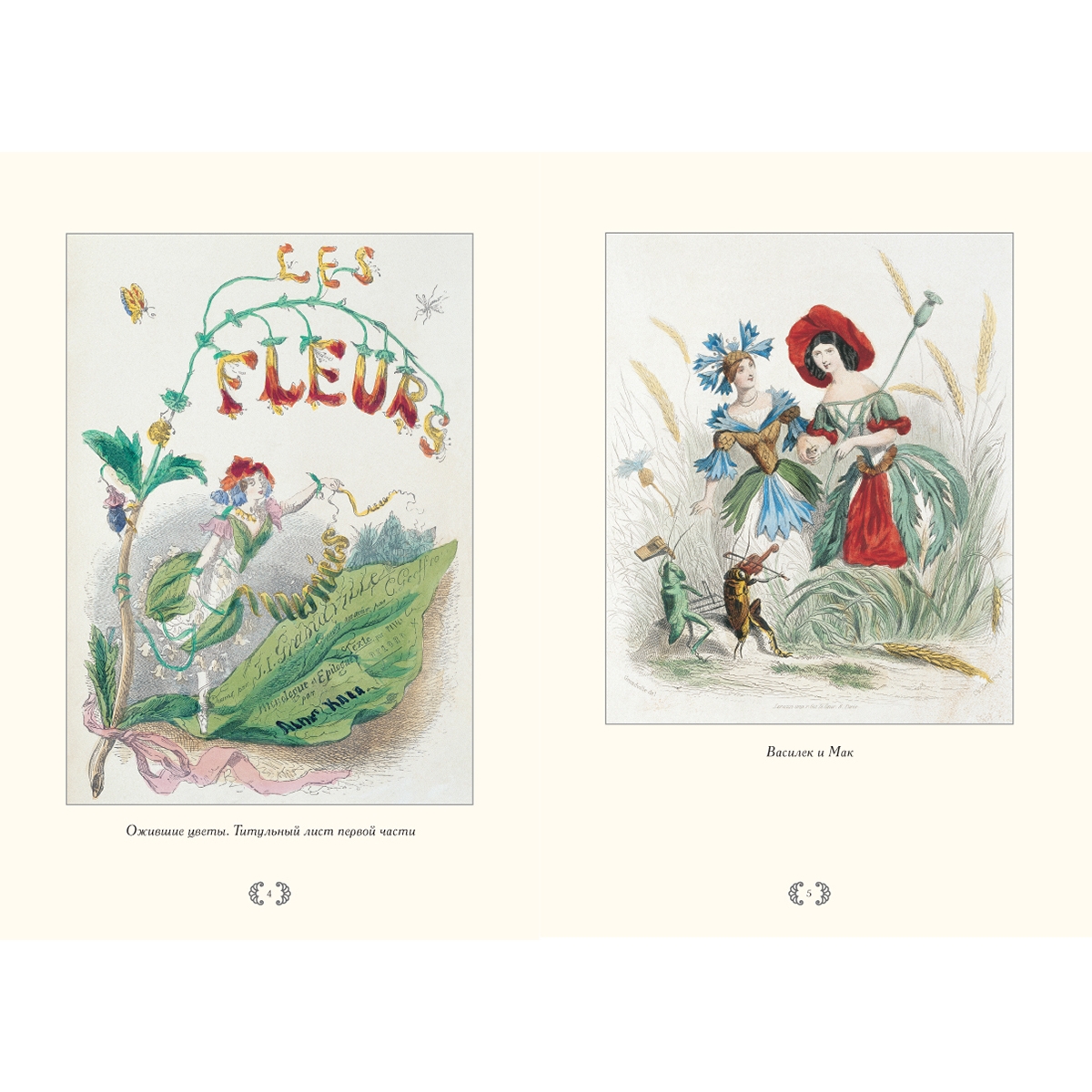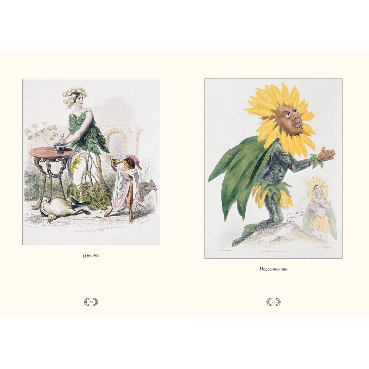 Двухтомник «Ожившие цветы» (Les Fleurs Animees) появился на свет в 1847 году. Название говорит само за себя: влюбленные, мстительные, царствующие, робкие – все чудесные создания флоры наделены человеческими чертами и эмоциями. Надменный Кактус, коварная Цикута, царственная Роза, игривый Виноград, скромные Фиалки – альбом представляет целую галерею характеров и сложный клубок взаимоотношений героев.
