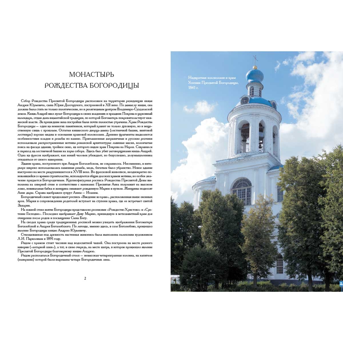 В альбом вошли фотографии двух известных объектов православной культуры, находящихся в Боголюбово: это краса древнерусского зодчества – храм Покрова на Нерли и множество различных построек, входящих в комплекс монастыря Рождества Богородицы.