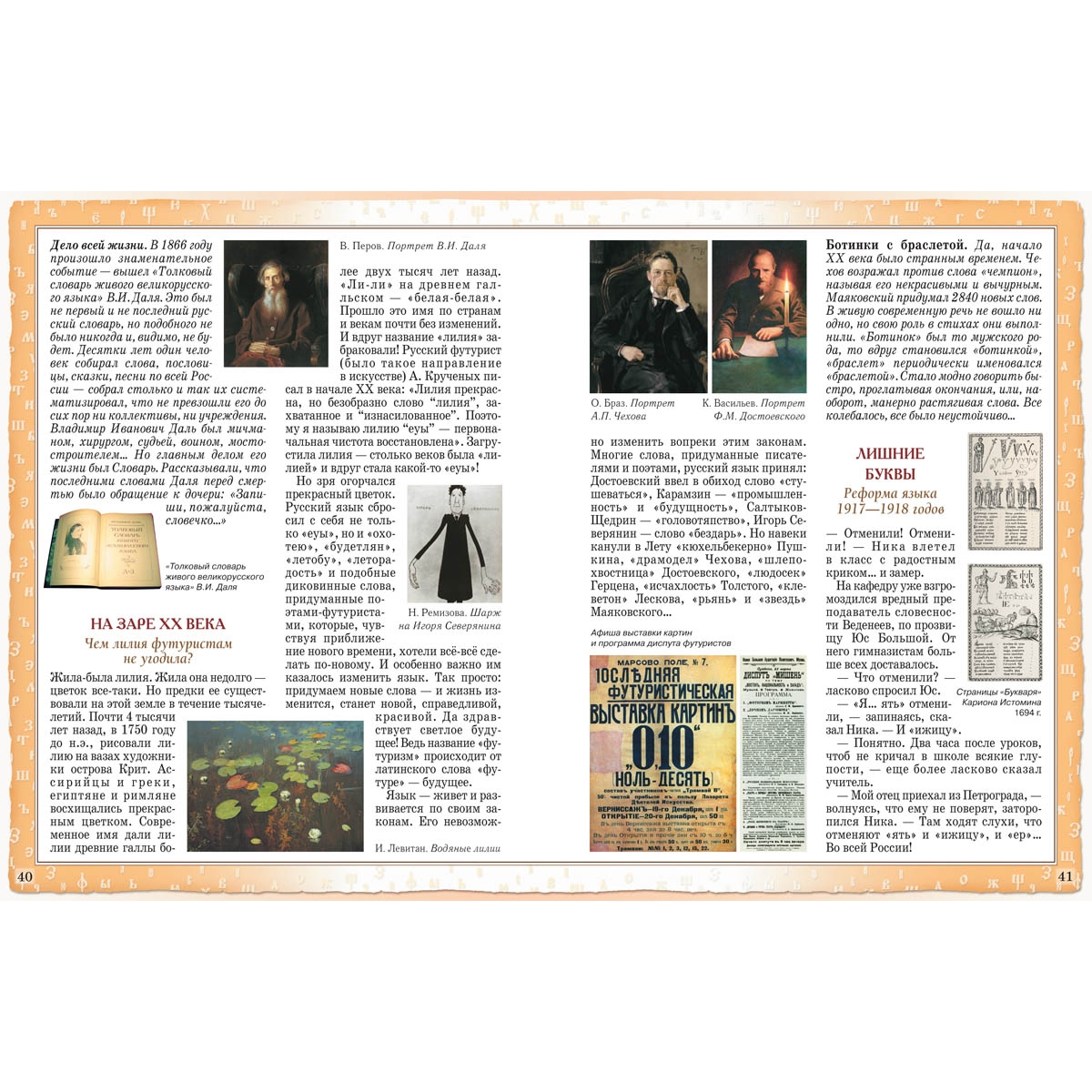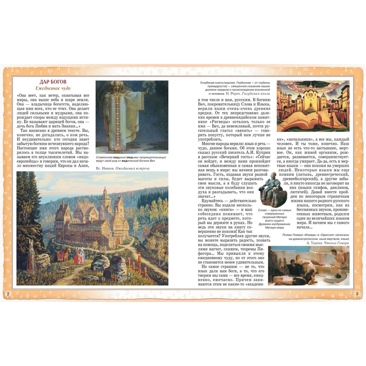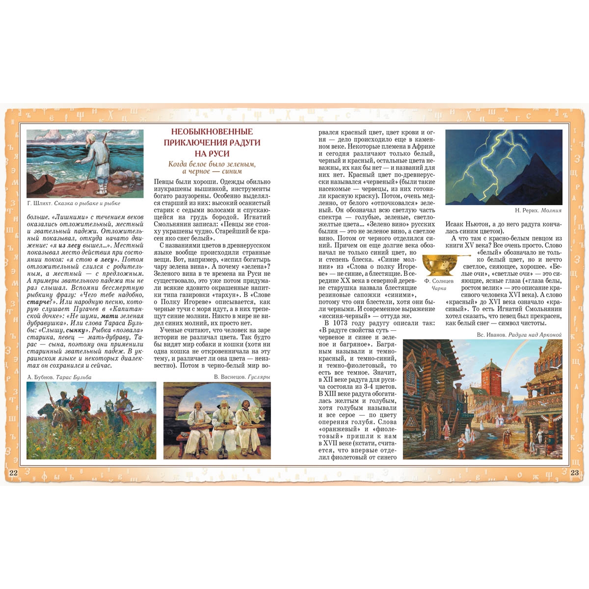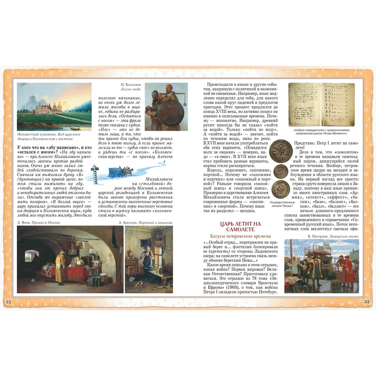 Русский язык – это зеркало, в котором отразились все исторические вехи нашего прошлого: жизнь и быт восточных славян, монголо-татарское нашествие на Русь, суровые времена правления Ивана Грозного и бурные события Смутного времени, ураганный ветер петровских реформ и революционные катаклизмы начала XX века. Поэтому вполне закономерно, что книга «Русский язык. Страницы истории» издана в серии «История России». Русский язык – один из крупнейших языков мира, самый распространенный из славянских языков – как по территории, так и по количеству людей (300 миллионов человек), считающих его родным. Значение русского языка для развития мировой культуры трудно переоценить, так как он был и остается языком великих писателей и поэтов: Пушкина и Гоголя, Тургенева и Чехова, Толстого и Достоевского. Недаром 2007 год был объявлен годом русского языка. Книга рассказывает о возникновении и развитии русского языка. Юный читатель сможет узнать, на каком языке говорили наши далекие славянские предки, как и почему изменялся язык на протяжении веков, какие исторические события оставили свой след в нашей сегодняшней речи. Главный акцент делается на то, что язык – это наше богатство, а народное достояние необходимо беречь. То, каким станет наш язык в будущем, зависит от нас, живущих сегодня, – не только от ученых-филологов, но и от политиков и журналистов, писателей и учителей, а также обыкновенных школьников. В книге большое количество иллюстраций, позволяющих дать представление о той или иной исторической эпохе, увидеть портреты людей, которые внесли свою лепту в развитие русского языка. Перед вами не скучный учебник с бесчисленным множеством монотонных правил и не меньшим количеством исключений. Легко, интересно, весело автор рассказывает о том, как, когда и почему появились в нашем языке знакомые и привычные слова, фразы, выражения, какие бескровные войны велись за чистоту русского языка, как писатели и поэты пытались «обновить» нашу речь и что из этого вышло. Книга «Русский зык. Страницы истории» издана в большой серии «История России» и предназначена для читателей среднего школьного возраста. Это издание может стать хорошим подспорьем в написании докладов и рефератов для учащихся средних классов, а также пробудить в них интерес для дальнейшего, более детального изучения отдельных аспектов истории языка. Многие народы верили: язык и речь — чудо, данное богами. Об этом хорошо сказал русский писатель А.И. Куприн в рассказе «Вечерний гость»: «Сейчас он войдет, и между нами произойдет самая обыкновенная и самая непонятная вещь в мире: мы начнем разговаривать. Гость, издавая звуки разной высоты и силы, будет выражать свои мысли, а я буду слушать эти звуковые колебания воздуха и разгадывать, что они значат…» Но самое странное — не то, что язык дали нам боги, а то, что его творим мы сами — все время, ежедневно, ежечасно. Причем занимаются этим не какие-то «академики», «начальники», а все мы, каждый человек. И ты тоже, конечно. Наш язык не есть что-то застывшее, мертвое. Он, как живой организм, рождается, развивается, совершенствуется. Давай вместе пройдем по некоторым страничкам жизни нашего родного русского языка, посмотрим, как из бессвязных звуков, произнесенных животным, родился один из величайших языков мира. Содержание Дар богов. Ежедневное чудо 2 Пись