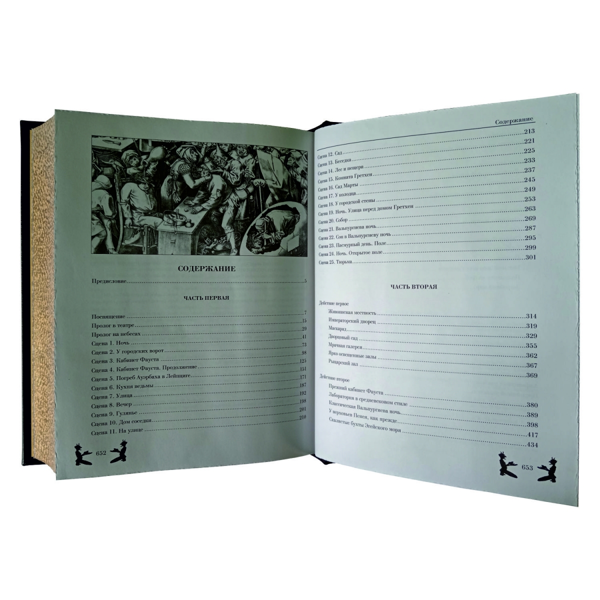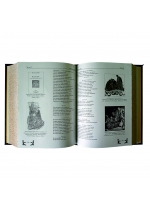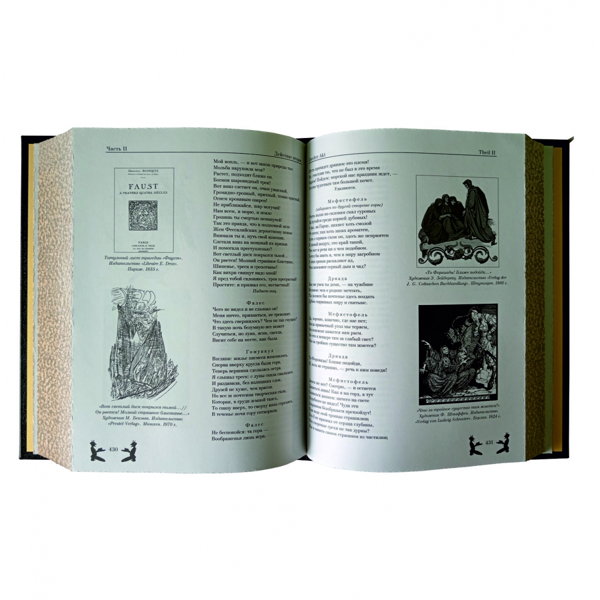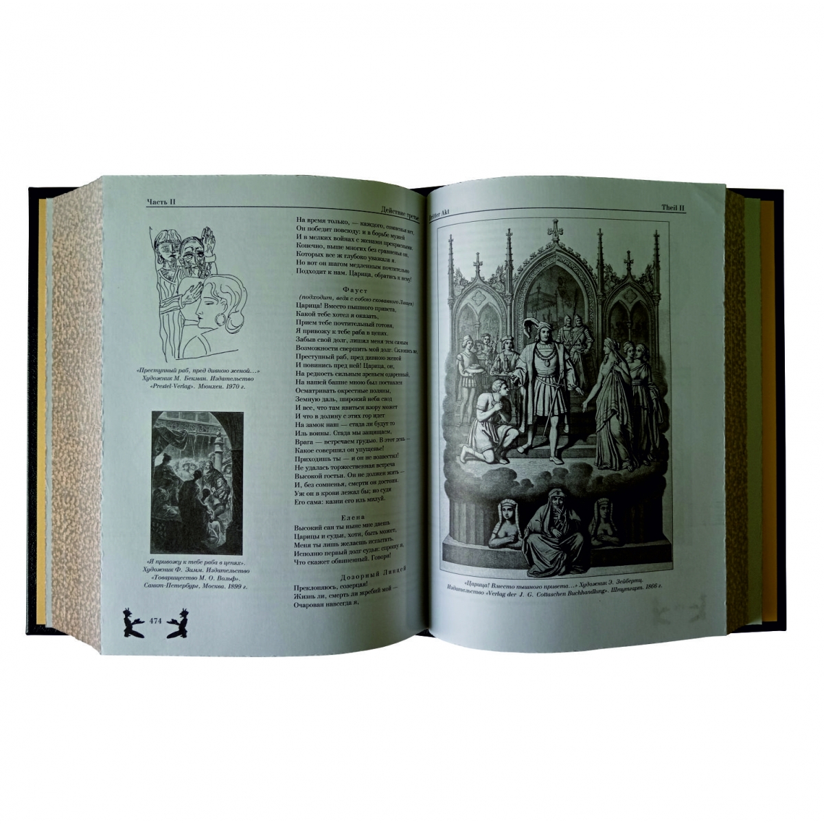 Еще одно из величайших произведений мировой литературы в оформлении по принципам серии: это энциклопедическое издание содержит более 1200 иллюстраций, в том числе из лучших изданий прошлого века. Многочисленные приложения: прозаический перевод сцены Вальпургиева ночь А.Л. Соколовского, комментарии, алфавитный указатель имен действующих лиц, алфавитный указатель мифологических имен и исторических лиц, алфавитный указатель географических названий, предметный указатель, библиография. Французский цельнокожаный переплет ручной работы на шнурах. Натуральная переплетная кожа. Форзац составной на кожаной слизуре. Дизайнерская бумага. Каптал двойной наборный, ручное плетение из шелковых нитей. Обрез торшонированный золотой фольгой. Ляссе шелковое. Тиснение полиграфической фольгой.