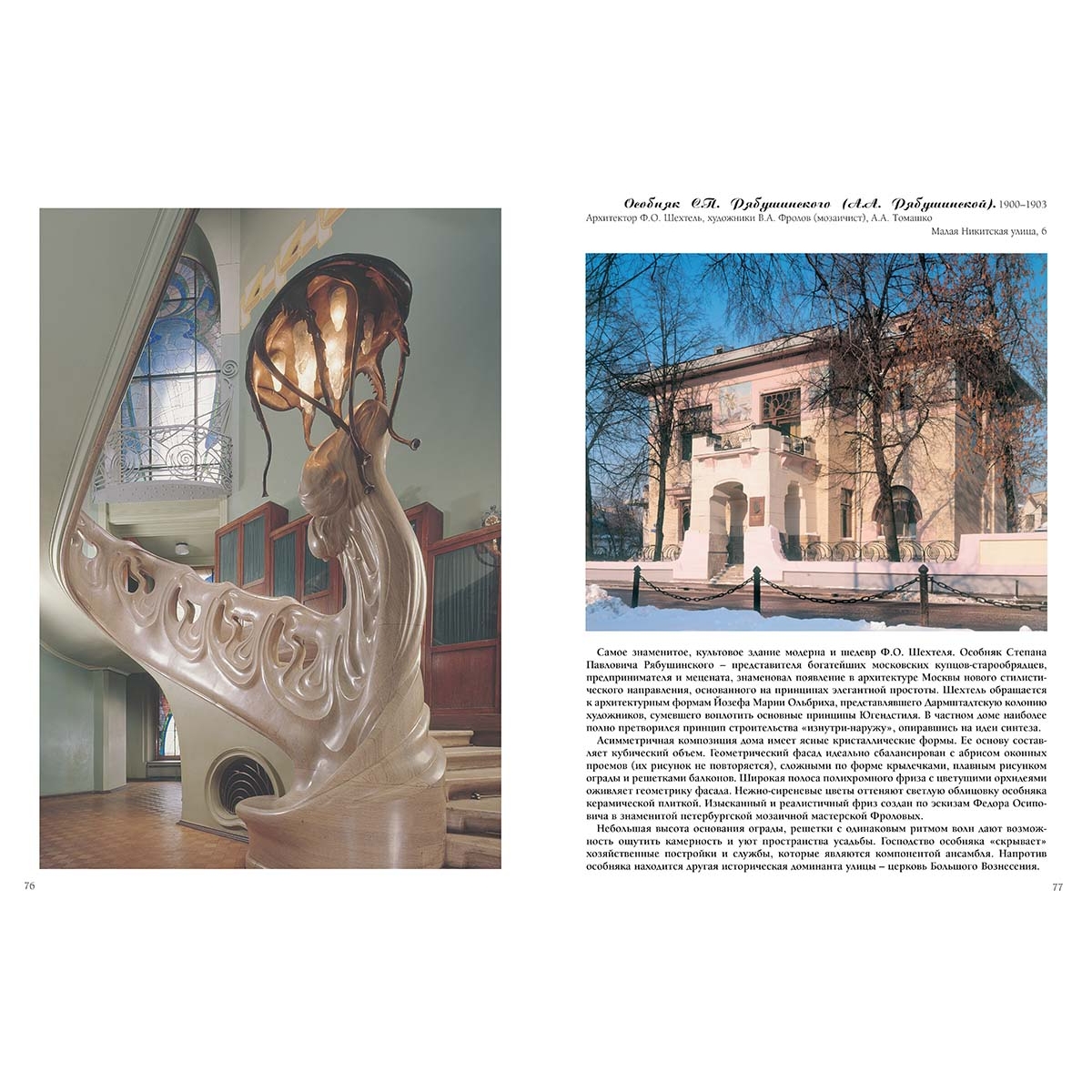 Перечень архитектурных памятников Городская усадьба П.А. и Н.П. Павловых. 1899–1900; 1905 39 Гостиница «Метрополь». 1899–1905 53 Дом бесплатных квартир братьев П., А. и В. Бахрушиных. 1900–1903 61 Дом Варваринского акционерного общества (гостиница «Нацио-наль»). 1901–1902 123 Дом дешевых квартир для одиноких (дом Г.Г. Солодовникова). 1906–1908 211 Дом Московского страхового общества (гостиница «Боярский двор»). 1901–1903 107 Доходный дом Ф.А. Александрова. 1902 125 Доходный дом А.Т. Филатовой (Я.М. Филатова). 1913 230 Доходный дом З.А. Перцевой. 1904–1905 187 Доходный дом И.П. Исакова (Московского торгово-строительного акционерного общества). 1904–1906 205 Доходный дом К.Г. Лобачева. 1904 179 Доходный дом М.В. Сокол. 1903 157 Доходный дом М.И. Фишера. 1913–1914 235 Доходный дом Р.Б. Бебутовой (семьи князей Бебутовых). 1908–1909 227 Доходный дом Я.М. Филатова. 1907–1909 217 Доходный дом персидского подданного Аджи-Мамед Усейн Ага Аминезарб. 1902 119 «Европейские бани» Ф.П. Кузнецова. 1905 201 Магазин торгового товарищества «Братья Елисеевы». 1898–1901 21 Московский Художественный театр. 1902 73 Особняк А.А. Тарасова. 1905 203 Особняк А.В. Маркина. 1904–1905 185 Особняк А.И. Дерожинской. 1901–1903, 1905 133 Особняк А.И. Кекушевой. 1900–1903 89 Особняк Д.Ф. Беляева. 1903 127 Особняк З.Г. Морозовой. 1893–1895 29 Особняк И.А. Миндовского. 1903–1904 165 Особняк К.А. Гутхейля. 1902–1903 151 Особняк Л.И. Гельтищевой. 1834; 1904 181 Особняк Н.И. Казакова. 1898–1901 35 Особняк О. Листа (Н.К. Кусевицкого). 1898–1899 15 Особняк П.И. Харитоненко. 1891–1893 43 Особняк П.П. Смирнова. 1901 111 Особняк С.П. Рябушинского (А.А. Рябушинской). 1900–1903 77 Скоропечатня товарищества А.А. Левенсона. 1900 63 Собственный дом архитектора Ф.О. Шехтеля. 1896 5 Собственный дом архитектора Ф.О. Шехтеля. 1910 229 Собственный особняк архитектора С.У. Соловьева. 1901–1903 95