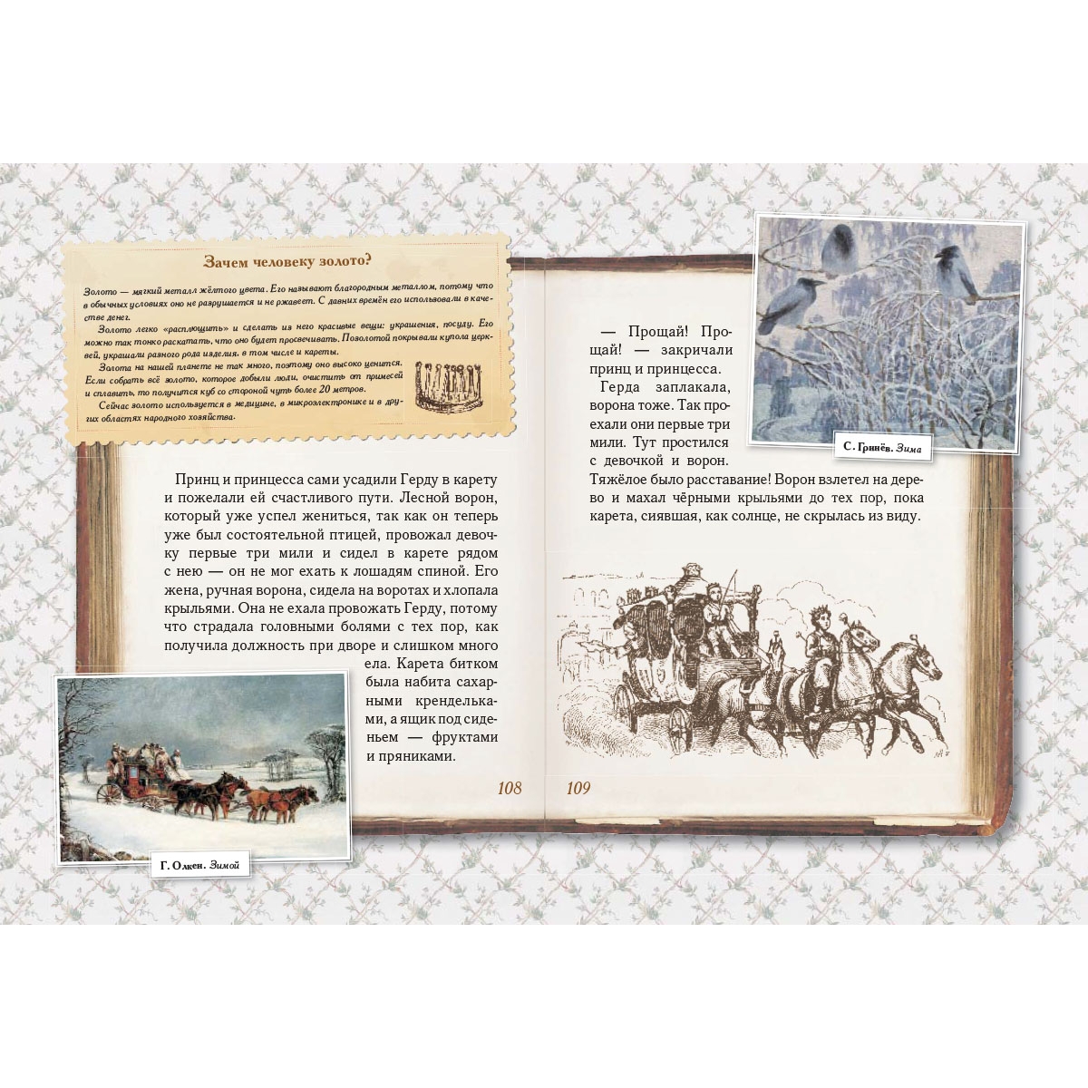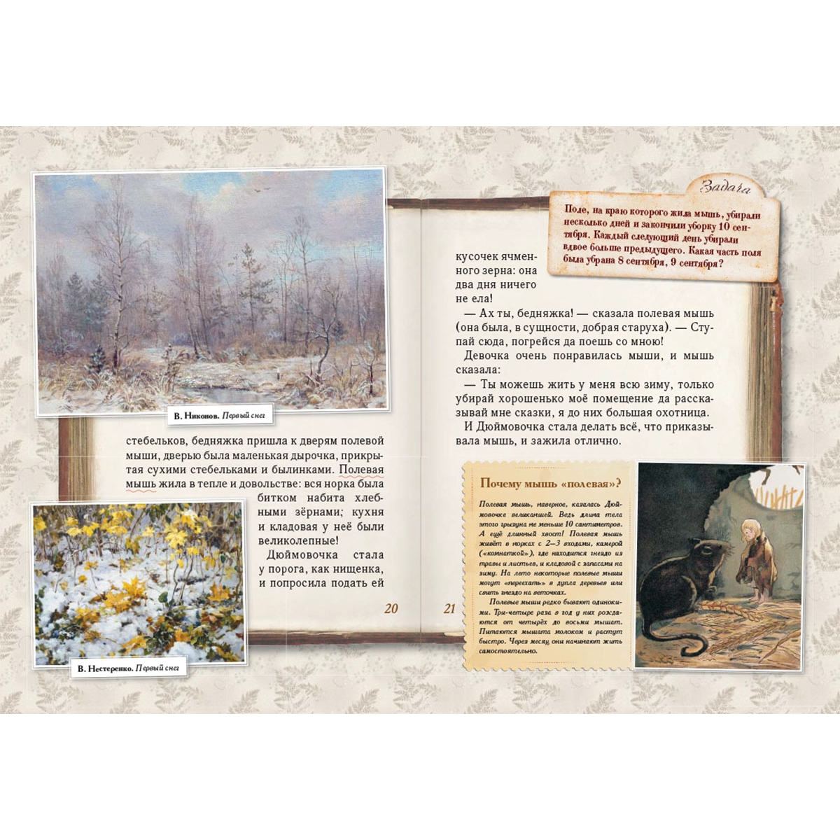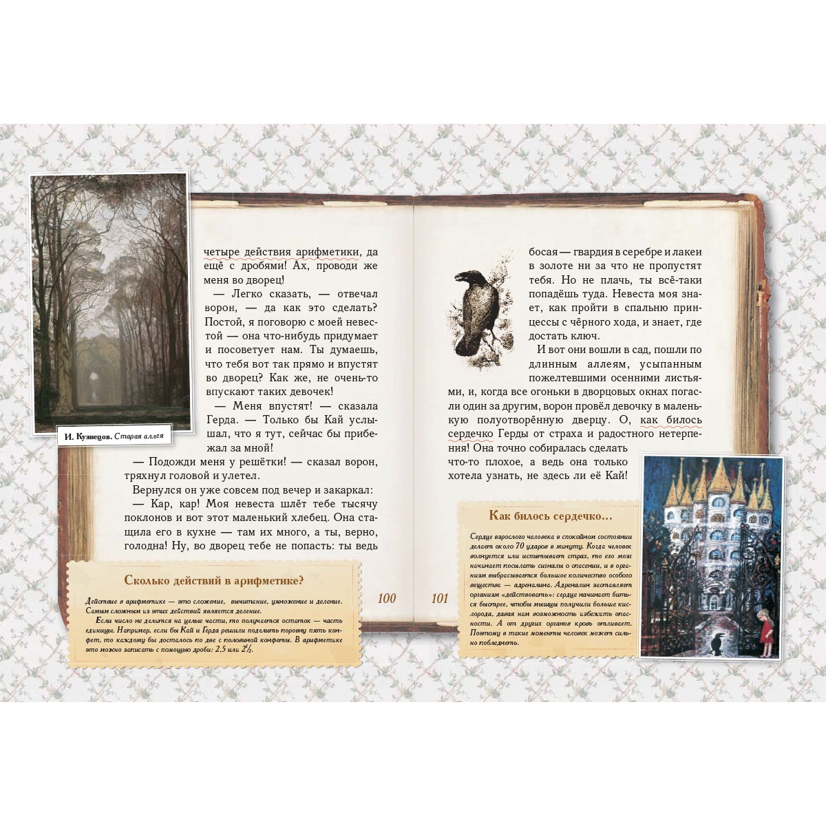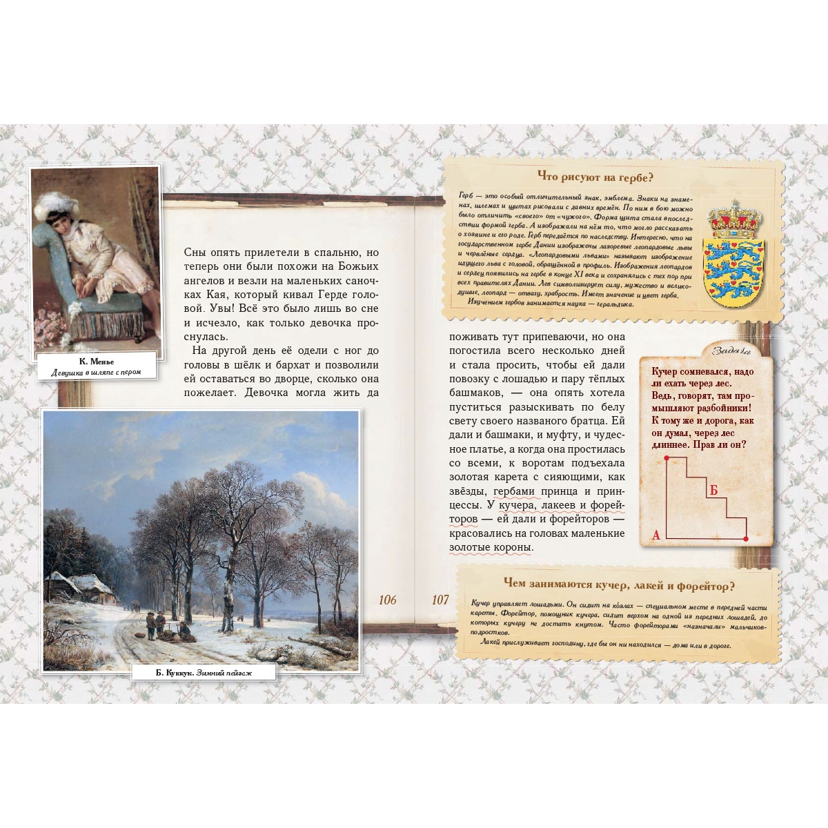Год издания 2018 Бумага мелованная матовая / 115 ISBN 978-5-3590-1158-7 Без сказок известного датского сказочника Ханса Кристиана Андерсена трудно представить детство. С ними, добрыми и мудрыми, росли дедушки и бабушки, папы и мамы, а теперь растут их дети и внуки. Приключения мужественной девочки Герды в сказке «Снежная королева» и крошечной девочки в сказке «Дюймовочка» волновали читателей сто лет назад, заставляют переживать и сейчас. В советское время переводчики пытались адаптировать сказочные истории к детскому восприятию. Теперь вы имеете возможность прочитать сказки, какими их написал автор. В тексте есть не очень понятные для маленького читателя слова, и они подробно объяснены. Юный читатель узнает много нового и интересного. Он сможет точнее представить ситуации, в которых разворачивается действие. Книга, которую вы держите в руках, – своего рода энциклопедия для любознательного малыша. Подобное издание в России подготовлено впервые, и мы надеемся, что у читателей и их родителей книга станет любимым изданием сказок одного из самых великих сказочников мира. Сожержание Дюймовочка 4 А что можно сварить из ячменного зерна? 4 Что такое дюйм? 5 Какой высоты дерево, на котором растут орехи? 6 Почему тюльпан назвали тюльпаном? 7 Почему жаба ночью забралась в дом? 8 Куда текут реки? 9 Разве в воде растут цветы? 10 Откуда берутся болота? 12 Зачем растению стебель? 13 А бывают июньские жуки или декабрьские? 14 А цветочный сок сладкий? 16 Роса 18 Почему птички улетают? 19 Почему осенний лист дрожит 19 Почему мышь полевая? 21 Зачем кроту бархатная шубка? 22 Галерея 23 Почему гнилушка светится 24 Почему Дюймовочка листком мяты укрыла ласточку? 26 Как можно пораниться о терновый куст 28 Сколько ног у паука? 32 Зачем нужно приданое? 34 Почему ласточки улетают в теплые края? 38 Озеро 39 Кто такие эльфы? 41 Где находится Дания? 44 Снежная королева (Сказ¬ка в се¬ми рас¬ска¬зах) 46 Зеркало и его осколки 46 Зеркало 47 Мальчик и девочка 51 Сад на подоконнике 51 Триумфальные ворота – 52 Пчёлы и их королева 55 Ледяные узоры 56 Городские ворота 67 Башенные часы 60 Как сделать увеличительное стекло 63 Снежинка 64 Санки 65 Шуба 69 Перестал зябнуть… 70 Цветник женщины, умевшей колдовать 72 Течение 74 Цветник 79 Роза 82 А почему в садике лето, а за воротами осень? 90 Почему осенью желтеют листья? 91 Туман 91 Принц и принцесса 92 Как можно сидеть на жемчужине и как она может походить на веретено? 98 Четыре действия арифметики 100 Как билось сердечко… 101 Герб 107 Кучер, лакей, форейтор 107 Золото 108 Маленькая разбойница 110 Кто такие разбойники и откуда они брались? 115 У Северного Полюса, на острове Шпицберген 117 Почему в рукавицах тепло? 119 Лапландия 120 Северное сияние 120 Карта пути преодоленного Гердой 121 Лапландка и финка 122 Жировая лампа 122 Жилище лапландки 123 Голубые бенгальские огни 123 Постучала в дымовую трубу… 124 Удивительные письмена 125 Что такое молитва? 130 «Отче наш» 130 Что такое легион? 131 Белые медведи 132 Что случилось во дворце снежной королевы и что случилось потом 132 Беленькие лисички 133 Китайская головоломка 135 Этна и Везувий 136 Год издания 2018 Бумага мелованная матовая / 115 ISBN 978-5-3590-1158-7 Без сказок известного датского сказочника Ханса Кристиана Андерсена трудно представить детство. С ними, добрыми и мудрыми, росли дедушки и бабушки, папы и мамы, а теперь растут их дети и внуки. Приключения мужественной девочки Герды в с