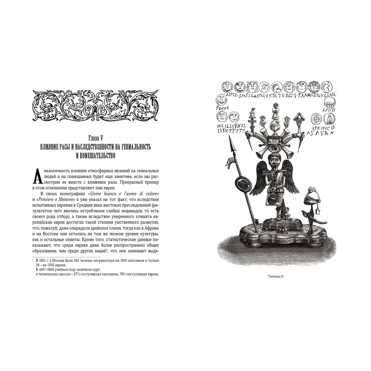 Репринтное издание. Ограниченный тираж- 10 экземпляров. Печать блока на дизайнерской бумаге с рисунками высокого разрешения. Иллюстрации проложены калькой. Книги врача-психиатра Ч. Ломброзо отличает острота проблематики и научная значимость. Дискуссионные по характеру, они погружают читателя в атмосферу неутихающих по сей день споров о природе гения и о прогрессе человечества в любви и посредством любви. Переплет ручной работы. Натуральная переплетная кожа. Каптал из шелковых нитей. Ляссе шелковое. Обрез торшонированный серебряной фольгой. Украшение переплета: тиснение полиграфической фольгой, металлизированная наклейка.