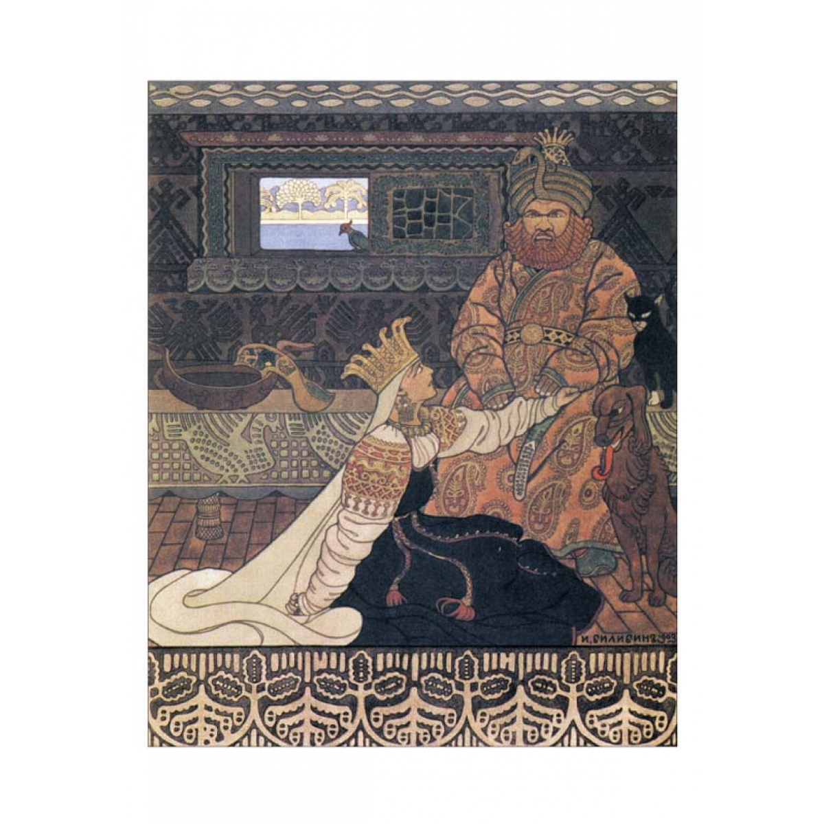 Художник Иван Яковлевич Билибин воплощал в своих работах русскую тему. Он и сам говорил, что его тяга к народному творчеству – «голос крови». Образы былинных героев, созданных им, воплотили представление народа о защитниках Отечества, оттого каждый из героев выразителен и едва ли не документален. Чтобы точно и образно отразить в своих иллюстрациях особенности народного творчества, он ездил в археологические экспедиции по Русскому Северу, делал зарисовки изб и церквей, собирал иконы, лубок, пряничные доски, вышивки. О героях его картин В.В. Стасов однажды сказал: «Народный дух в творчестве новых наших художников еще не погиб! Напротив!»