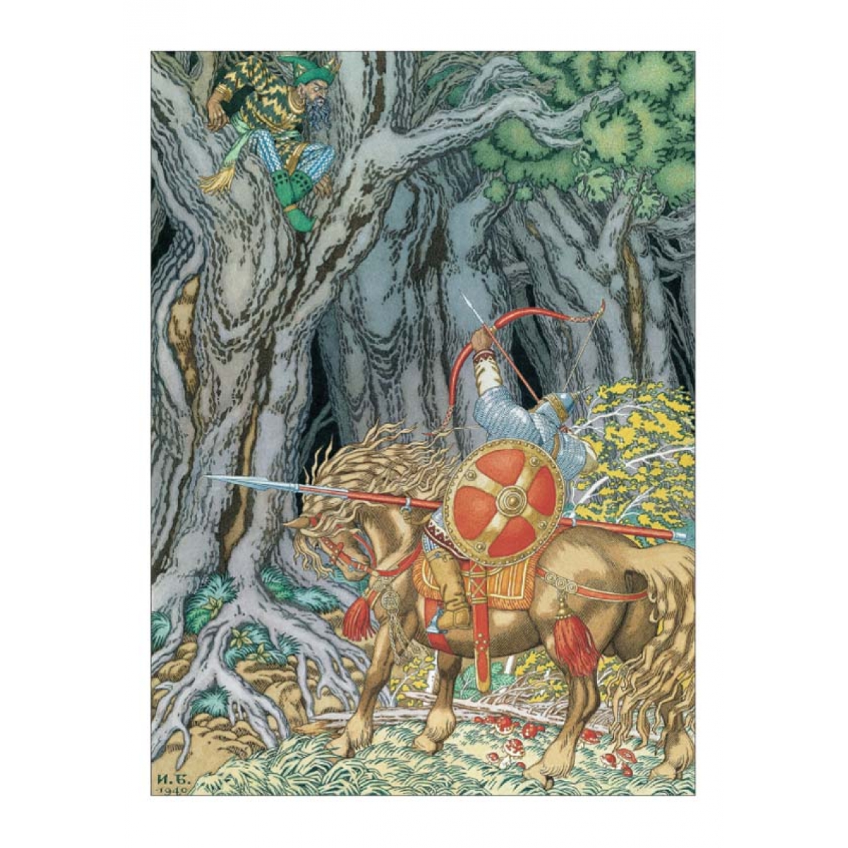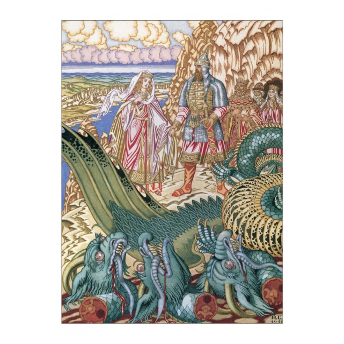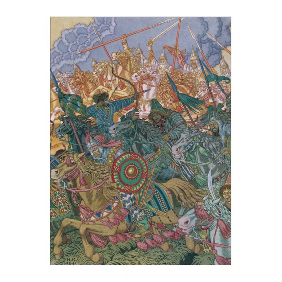 Иван Билибин был одним из лучших мастеров, воплощавших «русскую тему» в книгах и театральных декорациях. Образы былинных героев –Ильи Муромца, Добрыни, Вольги и пр. – давали выразительное и едва ли не реальное представление о защитниках Отечества.