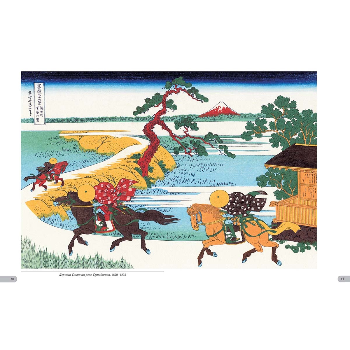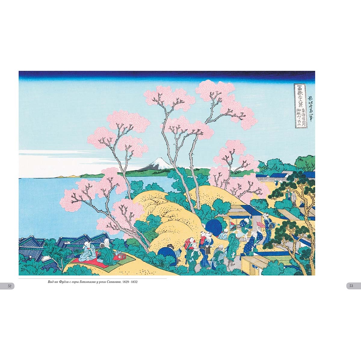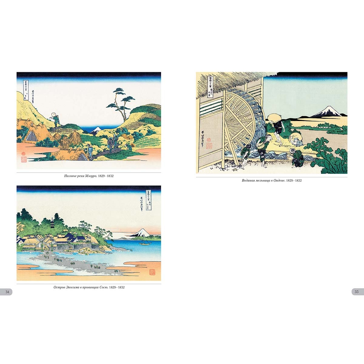 Список художников и их полотен или именной указатель Болото Кадзикадзава в Косю. 1829–1832 22–23 Большая волна в Канагаве. 1829–1832 4–5 Бухта Эдзири в провинции Сунсю. 1829–1832 26–27 В горах Тотоми. 1829–1832 28 Вид на гору Фудзи из развлекательного квартала в Сэндзю. 1829–1832 50 Вид на Фудзи из Каная, на дороге Токайдо. 1829–1832 60–61 Вид на Фудзи с горы Готэнъяма у реки Синагава. 1829–1832 52–53 Вид Фудзи от чайных плантаций Катакура в провинции Цуруга. 1829–1832 58 Внезапный дождь под горой. 1829–1832 7 Водяная мельница в Ондене. 1829–1832 35 Восхождение на гору. 1829–1832 62 Горный перевал в Косю. 1829–1832 7 Деревня Сэкия на реке Сумидагава. 1829–1832 40–41 Ёсида на тракте Токайдо. 1829–1832 36 Залив Нобото. 1829–1832 43 Изображение пляжа Тагоноура в Эдзири, тракт Токайдо. 1829–1832 24 Канал Усибори в провинции Дзёсю. 1829–1832 21 Кривая сосна в Аояме. 1829–1832 12 Местность Умэдзава в Сосю. 1829–1832 17 Морской путь в Кадзусу. 1829–1832 39 Мост Маннэн в Фукагаве. 1829–1832 8–9 Мост Нихонбаси в Эдо. 1829–1832 39 Мост Сэндзю в провинции Мусаси. 1829–1832 14–15 Накахара в провинции Сосю. 1829–1832 54 Низовье реки Мэгуро. 1829–1832 34 Ночной вид на мост Рёгокубаси с берега реки Оммаяга. 1829–1832 32–33 Обратная сторона Фудзи. Вид со стороны реки Минобугава. 1829–1832 45 Озеро в Хаконе в провинции Сосю. 1829–1832 44 Озеро Сувако в Синсю. 1829–1832 25 Оносиндэн в провинции Сунсю. 1829–1832 56–57 Остров Цукудадзима в Буё. 1829–1832 21 Остров Эносима в провинции Сосю. 1829–1832 34 Отражение в озере Мисака в провинции Косю. 1829–1832 45 Перевал Мисимагоэ в провинции Косю. 1829–1832 24 Победный ветер. Ясный день, или Красная Фудзи. 1829–1832 6 Побережье Ситиригахама в Сосю. 1829–1832 17 Равнина Фудзимигахара в провинции Овари. 1829–1832 19 Район Сундай в Эдо. 1829–1832 10–11 Район Ходогая, тракт Токайдо. 1829–1832 46 Река Тама в Бусю. 1829–1832 16 Река Татэкава в Хондзё. 1829–1832 48–49 Садзаэ-до, храм Пятисот Архатов. 1829–1832 30 Снежное утро на реке Коисикава. 1829–1832 31 Суруга-тё в Эдо. 1829–1832 31 Утренняя заря в Исава провинции Косю. 1829–1832 38 Храм Хонгандзи в Асакусе. 1829–1832 20