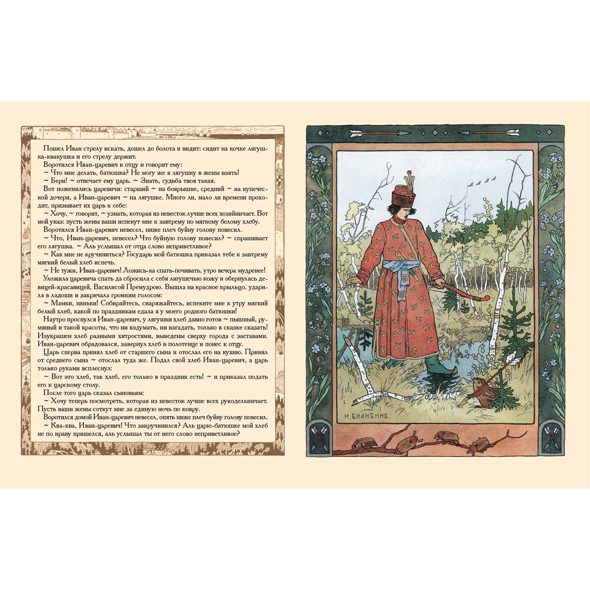 Билибин Иван Яковлевич (1876–1942) Иван Яковлевич Билибин родился в селе Тарховка под Санкт-Петербургом. Отец работал врачом в военно-морском госпитале. Мать будущего художника была дочерью знаменитого композитора А.Г. Рубинштейна. В доме Билибиных всегда царила творческая атмосфера. Иван Яковлевич вспоминал: «Насколько я себя помню, я всегда рисовал». Его учителем был И.Е. Репин, и ученик на всю жизнь сохранил к нему благоговейное отношение. Он часто рассказывал историю о том, как великий художник спас его рисунок: «Я трудился с углем в руках над каким-то очередным Антоном — и что-то с этим не клеилось… Проходит Репин… Мне кажется, что он даже не остановился, а так, на ходу, ткнул куда-то в мой рисунок большим пальцем, махнул по углю средним, потом огрызком угля сделал два или три резких удара — и мой Антон был спасен». Однажды художник провел лето в усадьбе своих друзей в Тверской губернии. Охотился, но больше просто бродил по хвойным — густым и дремучим — лесам и любовался тем, что видел. Что могло быть красивее красных мухоморов на зеленом мху? Или интереснее резных наличников на окнах, заглавного конька на высокой крыше? Как тут не взяться за карандаш и не начать рисовать? Билибин рано проявил творческую самостоятельность: он стал писать картины только на сюжеты из русской старины. Он с удовольствием иллюстрировал сказки. И первая из них оказалась «Об Иване-царевиче, Жар-птице и о сером волке». По настоянию отца он окончил университет и смог показать отцу диплом, но карьера юриста его не интересовала. Гораздо важнее для него было стать участником выставки, чтобы показать свои иллюстрации. Он стал книжным иллюстратором, и напечатанные сказки с его рисунками сразу сделали его знаменитым. Иван Яковлевич был веселый и добрый человек. У него было и еще одно любимое занятие: он сочинял стихи. Они были, как и их автор, веселые и добрые. Талант и трудолюбие, знание работ западных мастеров графики и любовь к русскому народному творчеству привели его к созданию собственного «билибинского» стиля — благородного и жизнерадостного. Сам Билибин говорил о своих рисунках, что они – «облагороженный лубок». Однако он выработал свой собственный стиль, от которого приходили в восторг современники художника. И совершенно заслуженно объединение «Мир искусства» приняло его в свои ряды. Художник широко использовал орнамент. А о его графике писали, что это «тщательно проработанный узорчатый контурный рисунок, расцвеченный акварелью».Иван Яковлевич Билибин родился в селе Тарховка под Санкт-Петербургом. Отец работал врачом в военно-морском госпитале. Мать будущего художника была дочерью знаменитого композитора А.Г. Рубинштейна. В доме Билибиных всегда царила атмосфера творчества. Иван Яковлевич вспоминал: «Насколько я себя помню, я всегда рисовал». Его учителем был И.Е. Репин, и ученик на всю жизнь сохранил к нему благоговейное отношение. Он часто рассказывал историю о том, как великий художник спас его рисунок: «Я трудился с углем в руках над каким-то очередным Антоном — и что-то с этим не клеилось… Проходит Репин… Мне кажется, что он даже не остановился, а так, на ходу, ткнул куда-то в мой рисунок большим пальцем, махнул по углю средним, потом огрызком угля сделал два или три резких удара — и мой Антон был спасен». Однажды художник провел лето в усадьбе