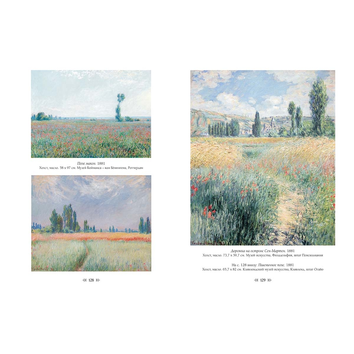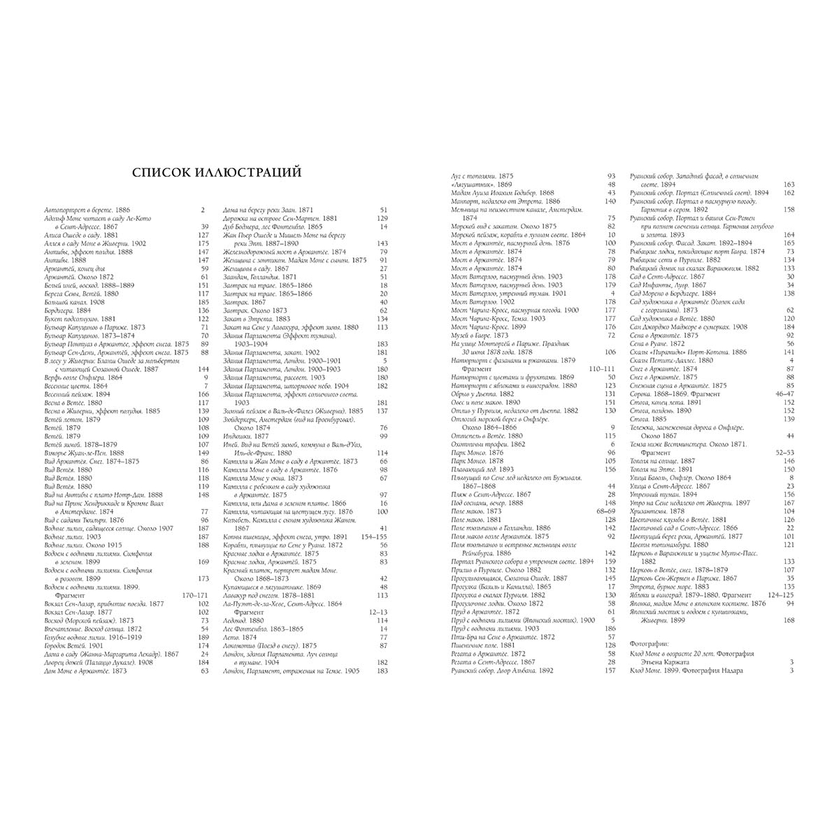 СПИСОК ИЛЛЮСТРАЦИЙ: Автопортрет в берете. 1886 2 Адольф Моне читает в саду Ле-Кото в Сент-Адрессе. 1867 39 Алиса Ошеде в саду. 1881 127 Аллея в саду Моне в Живерни. 1902 175 Антибы, эффект полдня. 1888 147 Антибы. 1888 147 Аржантёй, конец дня 59 Аржантёй. Около 1872 61 Белый иней, восход. 1888–1889 151 Берега Сены, Ветёй. 1880 117 Большой канал. 1908 185 Бордигера. 1884 136 Букет подсолнухов. 1881 122 Бульвар Капуцинов в Париже. 1873 71 Бульвар Капуцинов. 1873–1874 70 Бульвар Понтуаз в Аржантёе, эффект снега. 1875 89 Бульвар Сен-Дени, Аржантёй, эффект снега. 1875 88 В лесу у Живерни: Бланш Ошеде за мольбертом с читающей Сюзанной Ошеде. 1887 144 Верфь возле Онфлёра. 1864 9 Весенние цветы. 1864 7 Весенний пейзаж. 1894 166 Весна в Ветёе. 1880 117 Весна в Живерни, эффект полудня. 1885 139 Ветёй летом. 1879 109 Ветёй. 1879 108 Ветёй. 1879 109 Ветёй зимой. 1878–1879 107 Взморье Жуан-ле-Пен. 1888 149 Вид Аржантёя. Снег. 1874–1875 86 Вид Ветёя. 1880 116 Вид Ветёя. 1880 118 Вид Ветёя. 1880 119 Вид на Антибы с плато Нотр-Дам. 1888 148 Вид на Принс Хендриккаде и Кромме Ваал в Амстердаме. 1874 77 Вид с садами Тюильри. 1876 96 Водные лилии, садящееся солнце. Около 1907 187 Водные лилии. 1903 187 Водные лилии. Около 1915 188 Водоем с водными лилиями. Симфония в зеленом. 1899 169 Водоем с водными лилиями. Симфония в розовом. 1899 173 Водоем с водными лилиями. 1899. Фрагмент 170–171 Вокзал Сен-Лазар, прибытие поезда. 1877 102 Вокзал Сен-Лазар. 1877 102 Восход (Морской пейзаж). 1873 73 Впечатление. Восход солнца. 1872 54 Голубые водные лилии. 1916–1919 189 Городок Ветёй. 1901 174 Дама в саду (Жанна-Маргарита Лекадр). 1867 24 Дворец дожей (Палаццо Дукале). 1908 184 Дом Моне в Аржантёе. 1873 63 Дома на берегу реки Заан. 1871 51 Дорожка на острове Сен-Мартен. 1881 129 Дуб Бодмера, лес Фонтенбло. 1865 14 Жан Пьер Ошеде и Мишель Моне на берегу реки Эпт. 1887–1890 143 Железнодорожный мост в Аржантёе. 1874 79 Женщина с зонтиком. Мадам Моне с сыном. 1875 91 Женщины в саду. 1867 27 Заандам, Голландия. 1871 51 Завтрак на траве. 1865–1866 18 Завтрак на траве. 1865–1866 20 Завтрак. 1867 40 Завтрак. Около 1873 62 Закат в Этрета. 1883 134 Закат на Сене у Лавакура, эффект зимы. 1880 113 Здания Парламента (Эффект тумана). 1903–1904 183 Здания Парламента, закат. 1902 181 Здания Парламента, Лондон. 1900–1901 5 Здания Парламента, Лондон. 1900–1903 180 Здания Парламента, рассвет. 1903 180 Здания Парламента, штормовое небо. 1904 182 Здания Парламента, эффект солнечного света. 1903 181 Зимний пейзаж в Валь-де-Фалез (Живерни). 1885 137 Зюйдеркерк, Амстердам (вид на Гроенбургвал). Около 1874 76 Индюшки. 1877 99 Иней. Вид на Ветёй зимой, коммуна в Валь-д’Уаз, Иль-де-Франс. 1880 114 Камилла и Жан Моне в саду в Аржантёе. 1873 66 Камилла Моне в саду в Аржантёе. 1876 98 Камилла Моне у окна. 1873 67 Камилла с ребенком в саду художника в Аржантёе. 1875 97 Камилла, или Дама в зеленом платье. 1866 16 Камилла, читающая на цветущем лугу. 1876 100 Колыбель. Камилла с сыном художника Жаном. 1867 41 Копны пшеницы, эффект снега, утро. 1891 154–155 Корабли, плывущие по Сене у Руана. 1872 56 Красные лодки в Аржантёе. 1875 83 Красные лодки, Аржантёй. 1875 83 Красный платок, портрет мадам Моне. Около 1868–1873 42 Купающиеся в лягушатнике. 1869 48 Лавакур под снегом. 1878–1881 113 Ла-Пуэнт-де-ла-Хеве, Сент-Адресс. 1864. Фрагмент 12–13 Ледоход. 1880 114 Лес Фонтенбло. 1863–1865 14 Лето. 1874 77 Локомотив (Поезд в снегу). 1875 87 Лондон, здания Парламента. Луч солнца в тумане. 1904 182 Лондон, Парламент, отражения на Темзе. 1905 183 Луг с тополями. 1875 93 «Лягушатник». 1869 48 Мадам Луиза Иоахим Годибер. 1868 43 Манпорт, недалеко от Этрета. 1886 140 Мельница на неизвестном канале, Амстердам. 1874 75 Морской вид с закатом. Около 1875 82 М
