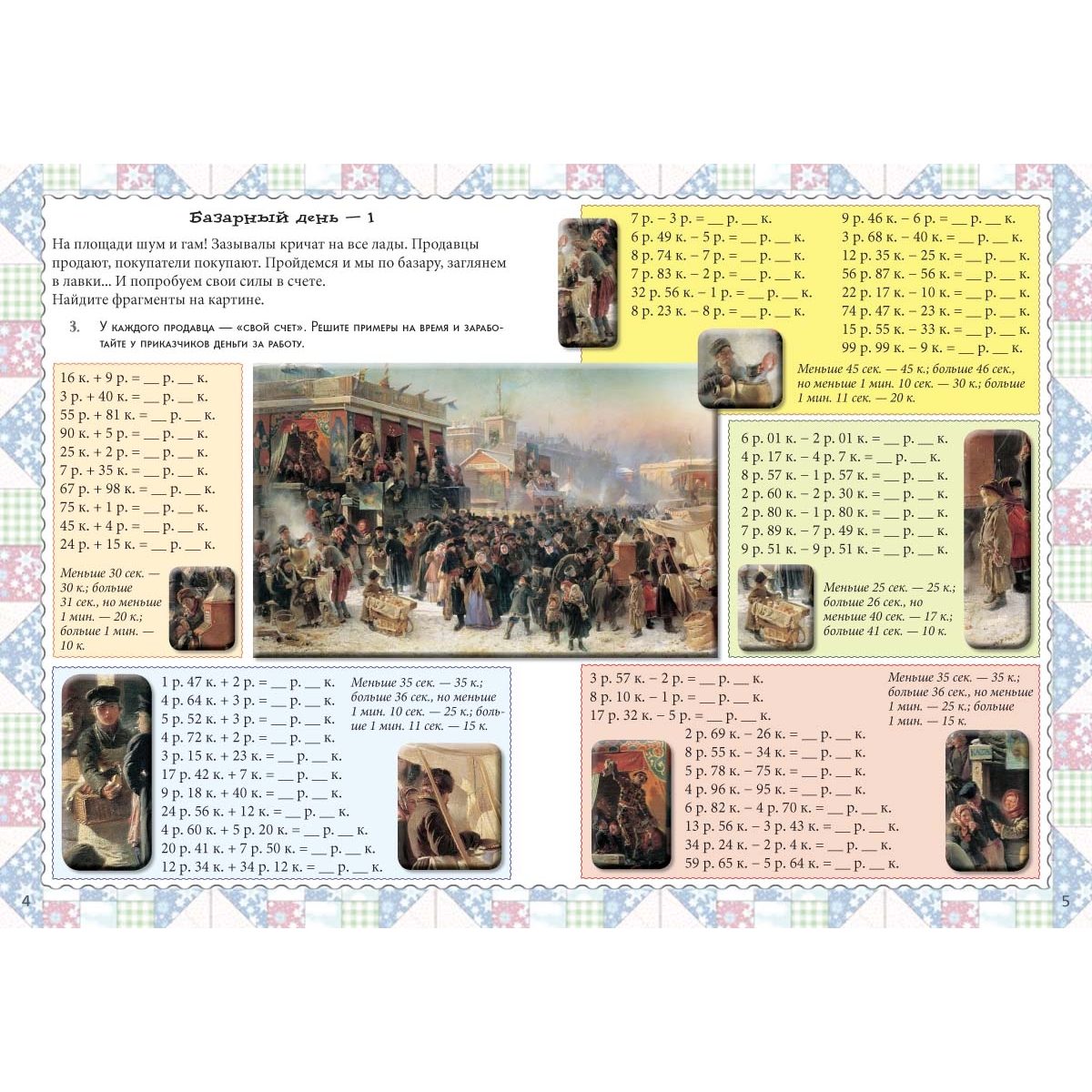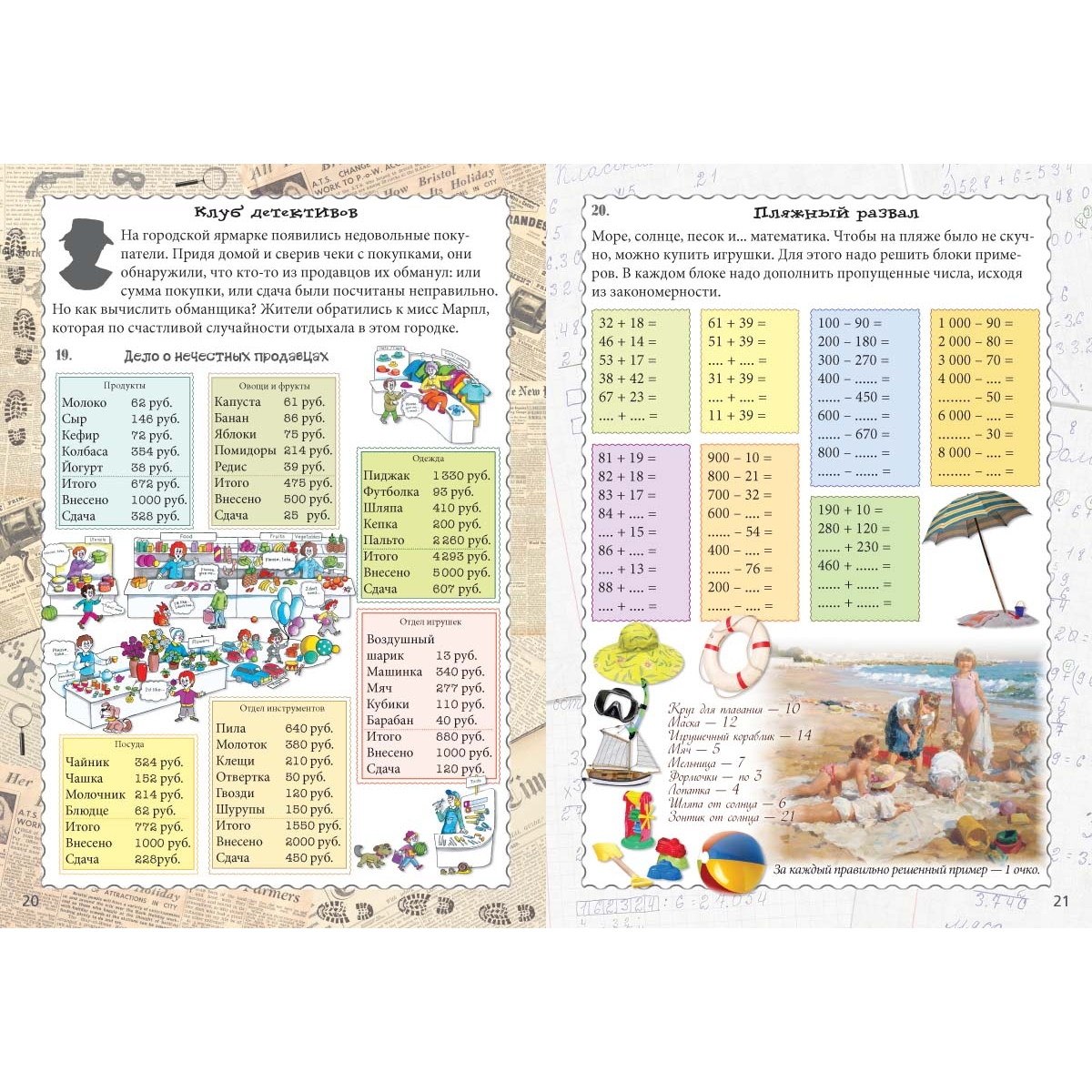 Весы – 1 2 Счет в пределах 10. Килограмм Базарный день – 1 4 Рубль и копейка. Использование этих категорий делает более понятным структуру многозначных чисел Базарный день – 2 6 Счет в пределах 100 без перехода через десяток Игра в магазин – 1 8 Дополнение к круглому числу в пределах 100 Магазин игрушек 10 Самостоятельная исследовательская работа. Не требуйте быстрого решения и формулирования вывода. Пусть ребенок сам совершит свое открытие Базарный день – 3 12 Дополнение до целого. Счет в пределах 100 Овощной рынок 14 Переход через десяток в пределах 100 Игра в магазин – 2 16 Дополнение к круглому числу в пределах 1000 Весы – 2 18 Удобный счет Клуб детективов 20 Оценка результата Пляжный развал 21 Дополнение к круглому числу в пределах 1000 Весы – 3 22 Счет круглыми числами в пределах 1000 Ярмарка 24 Фруктовое изобилие 26 Счет с переходом через десяток в пределах 100, подготовка к операциям с четырехзначными числами Конкурс среди продавцов 28 Решение примеров с переходом через сотню типа 112 – 35 Поехал купец торговать 30 Задача с экономической составляющей Содержание с комментариями 31 Ответы 31 «Устный счет — гимнастика для ума». Сделать его интересным и разнообразным поможет квест-тренажер «Базарный день», предназначенный для учеников 2–4 классов. Задание каждого разворота направлено на отработку определенного типа примеров устного счета: от счета в пределах 10 до сложения и вычитания четырехзначных чисел, отработку понятий дополнения до круглого числа, а также удобного счета. Использование понятий рублей и копеек делает более понятным структуру многозначных чисел и приближает ребенка к реальной жизни. Тренажер подойдет как для индивидуальной работы, так и для коллективных квестов на уроках и занятиях математических кружков. Рекомендуется к использованию вместе с книгой «Квест-тренажер УСТНЫЙ СЧЕТ. Сложение и вычитание», а также с другими тетрадями для коллективных квестов.