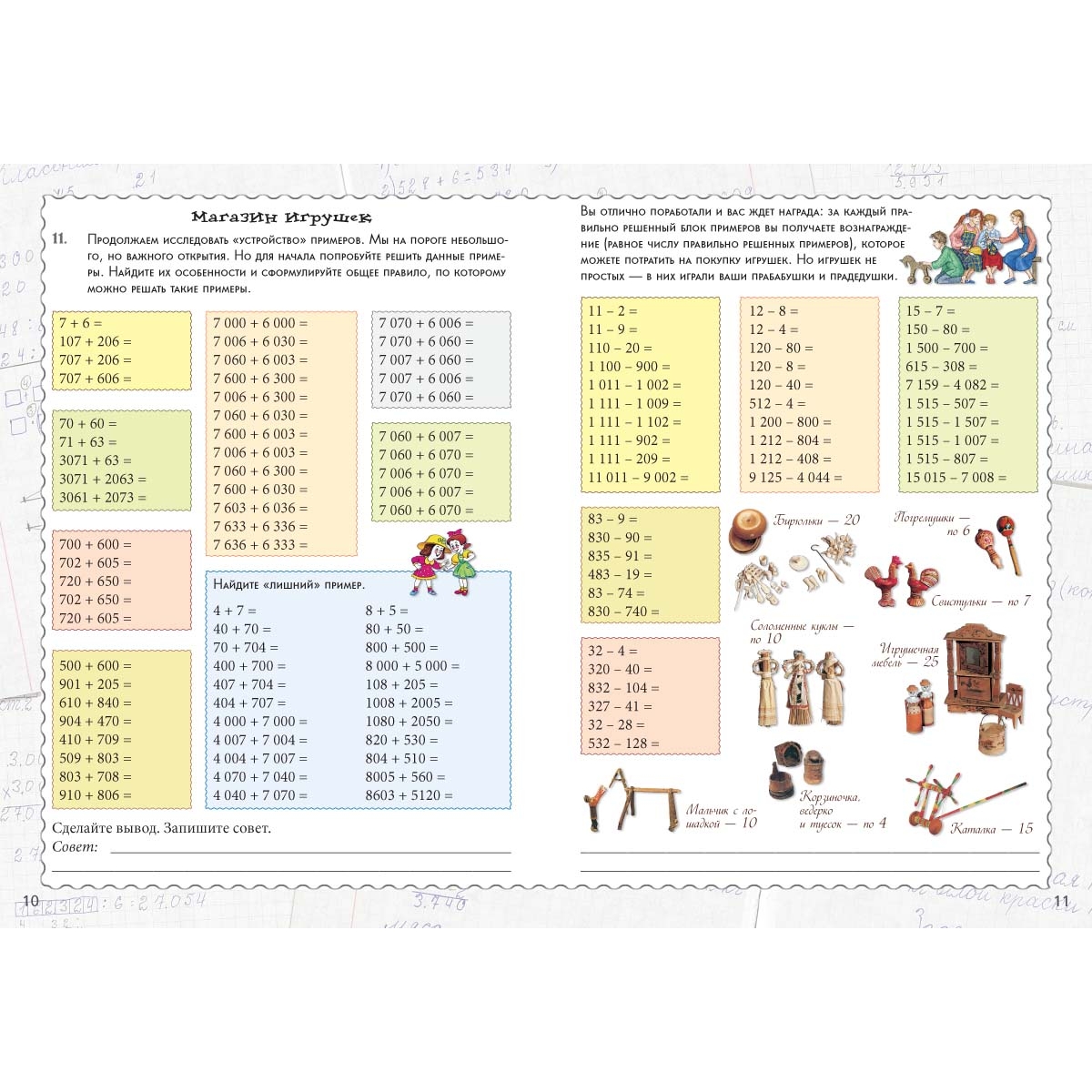 Знакомство с многозначными числами полезно начинать с освоения счета в рублях и копейках. Данное пособие поможет сделать это в игровой форме. Ребенку предлагается не только решить примеры, но и «купить» на заработанные деньги товары.