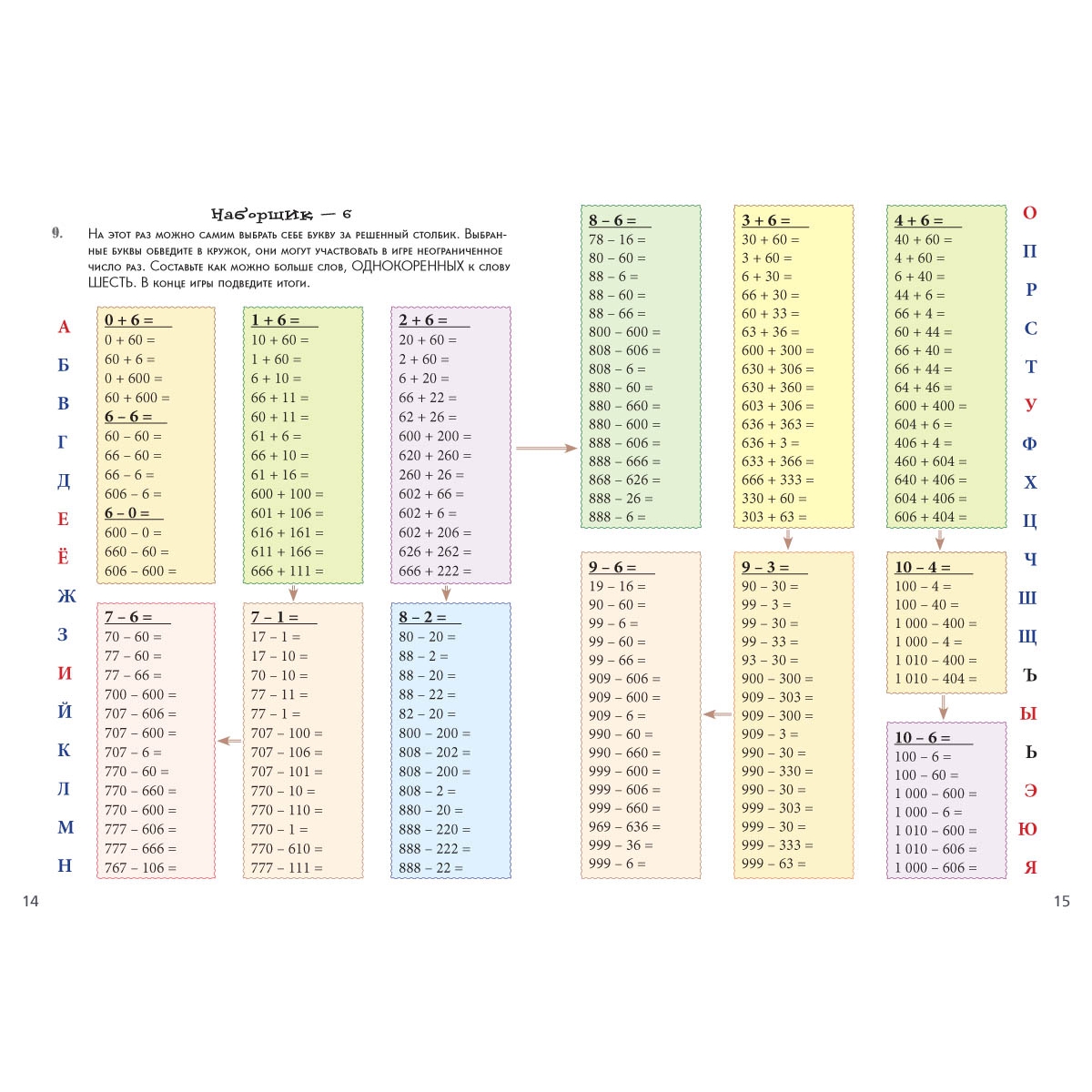 Всем известна словесная игра «Наборщик», в которой надо составить как можно больше слов из одного длинного слова? Наборщик — набор, борщ, рак, бар, бор «А при чем здесь устный счет?» — спросите вы. Мы по аналогии придумали игру «Математический наборщик», которая сочетает в себе и лингвистику, и устный счет. Суть игры проста: решив столбик примеров, участник получает в награду букву. Еще один столбик — новая буква и так далее… Задача игрока – собрать как можно больше слов из «заработанных букв». Но это еще не все! За составленные слова игрок получает очки, которые можно потратить на «обустройство» пустынного берега реки, превратив его в райский уголок. Примеры составлены на основе принципа «решения по аналогии». Используя его, можно уже во втором классе решать примеры с многозначными числами. Тренажер предназначен для учеников 1–2 классов, идеально подойдет для работы в команде 2–4 человека. Рекомендуется к использованию вместе с книгой «Квест-тренажер УСТНЫЙ СЧЕТ. Сложение и вычитание», а также с другими тетрадями для коллективных квестов.