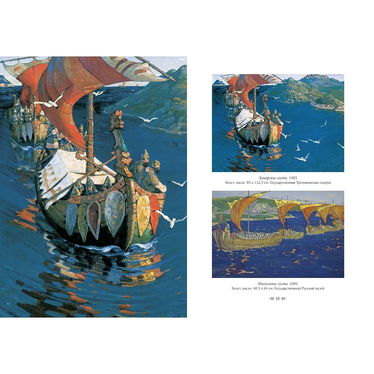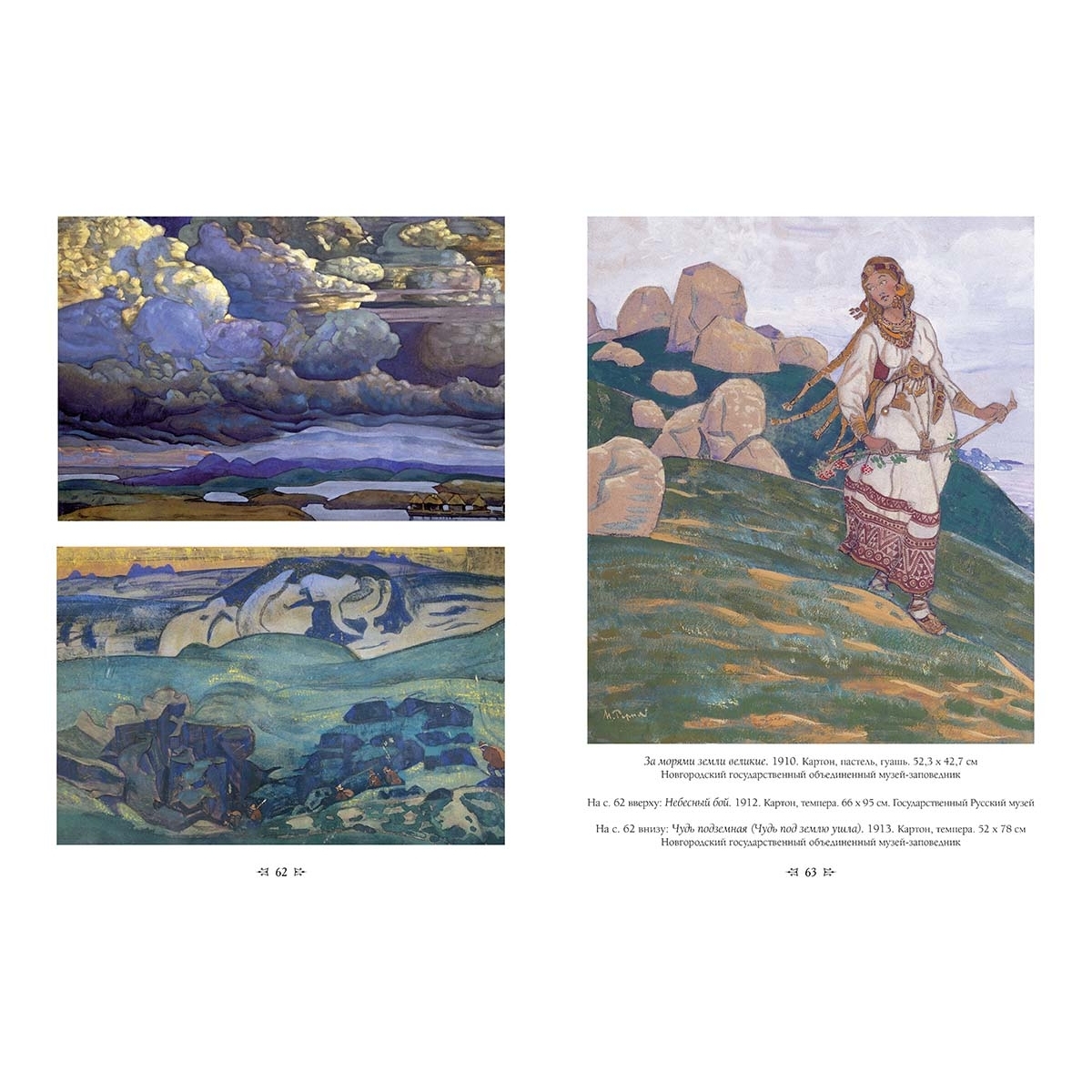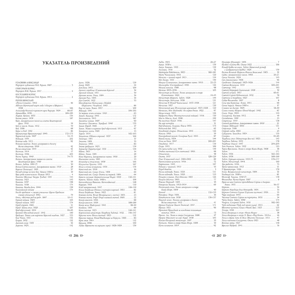 ГОЛОВИН АЛЕКСАНДР Портрет художника Н.К. Рериха. 1907 5 ГРИГОРЬЕВ БОРИС Портрет Н.К. Рериха. 1917 4 КУСТОДИЕВ БОРИС Портрет художника Н.К. Рериха. 1913 2 РЕРИХ НИКОЛАЙ «Песнь Сольвейг». 1912 46 Абд-аль-Мутталиб ищет воду («Хосров и Ширин»). 1938 166 Александр Невский поражает ярла Биргера. 1904 66–67 Армагеддон. 1936 184–185 Ашрам. Цейлон. 1931 154 Башня ужаса. 1939 187 Баян. Декоративное панно из сюиты Богатырский фриз. 1910 19 Бой со змеем. Эскиз. 1912 70 Бой. 1906 68 Борис и Глеб. 1942 86 Брамапутра (Брахмапутра). 1945 172–173 Варяжский путь. 1907 14–15 Ведущая. 1944 202 Веления неба. 1915 92 Великая жертва. Эскиз декорации к балету Весна священная. 1910 42 Весна священная. 1945 42 Вестник. 1914 17 Вестник. 1946 203 Весть Тирону. 1940 74–75 Витязь. Декоративное панно из сюиты Богатырский фриз. 1910 19 Волхов. Ладога. 1899 (?) 50 Вольга Святославович. Декоративное панно. 1910 28 Вороны (Зловещие). 1901 37 Восход солнца на поле боя. Начало 1900-х 39 Враг рода человеческого. Плакат. 1915 4 Гималаи (Жилище Такура. Гундла). 1931 143 Гималаи. 1925 143 Гималаи. 1937 158 Гималаи. 1938 174 Гималаи. Нанда-Дэви. 1944 158 Гималайский пейзаж 174 Гнездо преблагое – глазам утешение (Древо Преблагое глазам утешение). 1912 79 Гонец. «Восстал род на род». 1897 10–11 Горный пейзаж. 1925 165 Горный пейзаж. 1937 174 Город строят. 1902 31 Город. Тайны стен. 1920 107 Град обреченный. 1914 94–95 Грозный (Последний ангел). 1942 190 Грядущее. Эскиз для картины Красный всадник. 1927 125 Гуга Чохан. 1931 142 Гумран. 1932 152 Далекий север. 1902 16 Деревня. 1924 142 Дзонг. 1928 159 Дозор. 1905 24 Дом духа. 1915 109 Древнее городище (Славянская деревня) 34 Древний пейзаж. 1911 50 Древняя жизнь. Этюд. 1904 36 Древняя Русь. 1903 34 Дух Святой. 1922 53 Единоборство Мстислава с Редедей (Пересвет с Челубеем). 1943 86 Еще не ушли. Эскиз. 1917 109 Ждущая. 1941 194–195 За морями земли великие. 1910 63 Закат. Кашмир. 1943 172 Заклинатель. 1943 187 Заклятие земное. 1907 90 Заклятие (Заклятие. Терафим). 1940 135 Замок (Город). 1906 17 Замок. Эскиз к картине Град обреченный. 1913 97 Заморские гости. 1901 13 Зарево. 1914 102–103 Защитник (Облако-стрелок). 1937 164 Зловещие. 1901 37 Змиевна. 1906 35 Знамение. 1915 83 Знамя грядущего. 1925 139 Зороастр (Заратустра). 1931 134 Идолы. 1901 14 Идолы. Эскиз. 1901 28 Илья Муромец. Декоративное панно. 1910 20 Иноземные гости. 1901 13 Искандер и отшельник. 1938 166 Искушение Христа. 1933 167 Исса и голова великанова. 1939 134 Каменный век. 1910 16 Каменный век. Север. Олени. 1904 64 Каменный век. Север. Охота на моржей. 1904 64 Камень несущая (Держательница Мира). 1933 150–151 Камень. Тайные знаки. 1910-е 108 Канченджунга (Гималаи. Канченджанга) 148 Караван. 1931 130 Клад захороненный. 1947 118–119 Книга Голубиная (Помин о четырех королях). 1911 82 Книга Голубиная. Эскиз. 1922 81 Княжая охота. Вечер (Возвращение с охоты). 1901 23 Княжая охота. Утро (Утро княжьей охоты). 1901 22 Ковер-самолет. 1916 88 Ковер-самолет. 1939 188–189 Ковка меча (Нибелунги). 1941 98–99 Колдуны. 1905 89 Конь счастья. 1925 140–141 Королевский монастырь (Твердыня Тибета). 1932 156–157 Красные кони (Кони счастья). 1925 152 Красные паруса. Поход Владимира на Корсунь. 1900 83 Крик змия. 1914 112 Кришна. 1946 199 Ладак (Крепость на вершине горы). 1928–1929 159 Ладьи. 1903 26–27 Лахул. 1930-е 159 Лахул. Гималаи. 1932 159 Лесовики. 1916 52 Майтрейя Победитель. 1925 180–181 Мать Чингисхана. 1933 120 Мехески – лунный народ. 1915 114 Меч Гесару. 1931 149 Микула Селянинович. Декоративное панно. 1910 22–23 Милосердие (Сострадание). 1936 116 Могила викинга. 1908 98 Молния. 1935–1936 105 Монастырь во Пскове. Эскиз декорации к опере Псковитянка. 1920 44–45 Монастырь Шаругён. Тибет. 1928 144 Монастырь. Монголия. 1938 131 Монголия II (Поход Чингисхана). 1937–1938 12