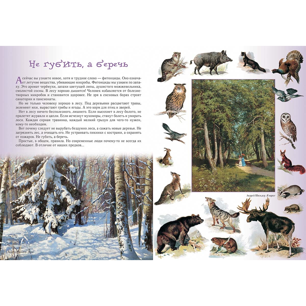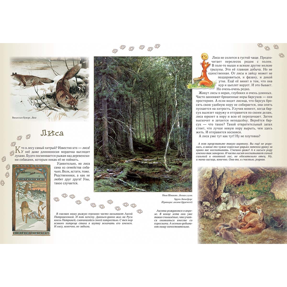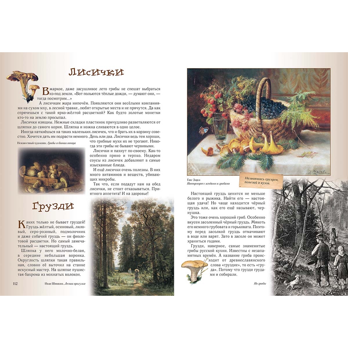 (из верстки) Прогулка первая Познавательная 4 Не губить, а беречь 6 Низкий поклон деревьям 8 Леший 9 Водяной 10 Баба-яга 12 Прогулка вторая Звериная 14 Медведь 16 Лось 18 Волк 20 Лиса 22 Барсук 24 Белка 24 Заяц 26 Кабан 28 Рысь 29 Бобёр 30 Ёж 32 Крот 33 Прогулка третья Древесная, тоже интересная 34 Дуб 36 Береза 38 Сосна 40 Ель 42 Осина 44 Липа 46 Клён 48 Прогулка четвёртая Травяная 50 Весенний первоцвет 52 Сон-трава 54 Медуница 55 Зверобой 55 Фиалка 56 Тысячелистник 57 Незабудка 58 Ландыш 60 Одуванчик 61 Колокольчики 62 Ромашка 64 Подорожник 66 Иван-да-марья 67 Иван-чай 68 Прогулка пятая Пернатая 70 Соловей 72 Дрозд 74 Тетерев 76 Глухарь 78 Синицы 80 Дятел 82 Сова 84 Кукушка 86 Снегирь 88 Клёст 89 Журавль 90 Ястреб 92 Коршун 94 Сокол 95 Скворец 96 Сойка 97 Цапля 98 Выпь 99 Ворон 100 Прогулка шестая Грибная 102 Белый 104 Подберёзовик 106 Подосиновик 107 Моховик 108 Рыжики 108 Маслята 109 Мухомор 110 Бледная поганка 111 Лисички 112 Грузди 112 Опята 114 «Ведьмины кольца» 115 Как не заблудиться 116 Прогулка седьмая Ягодная 118 Черёмуха 120 Рябина 122 Калина 124 Земляника 126 Черника 127 Брусника 128 Малина 129 Клюква 130 Сфагнум 131 Прогулка восьмая Ползающая, прыгающая, жужжащая 132 Муравьи 134 Пауки 136 Змеи 138 Лягушки 140 Жаба 141 Шмель 142 Несколько слов на прощание 143