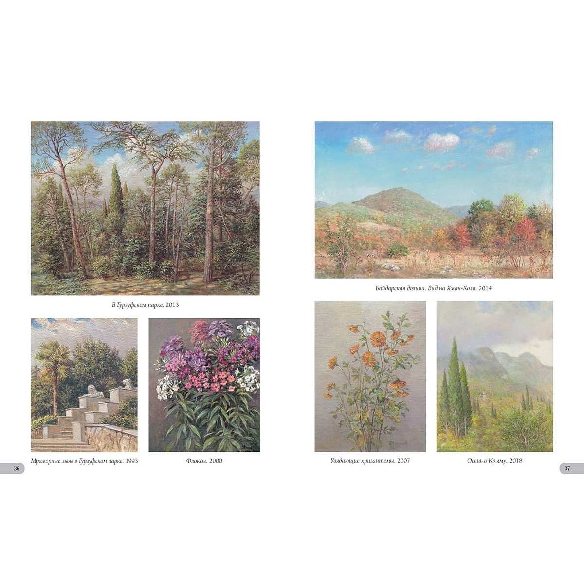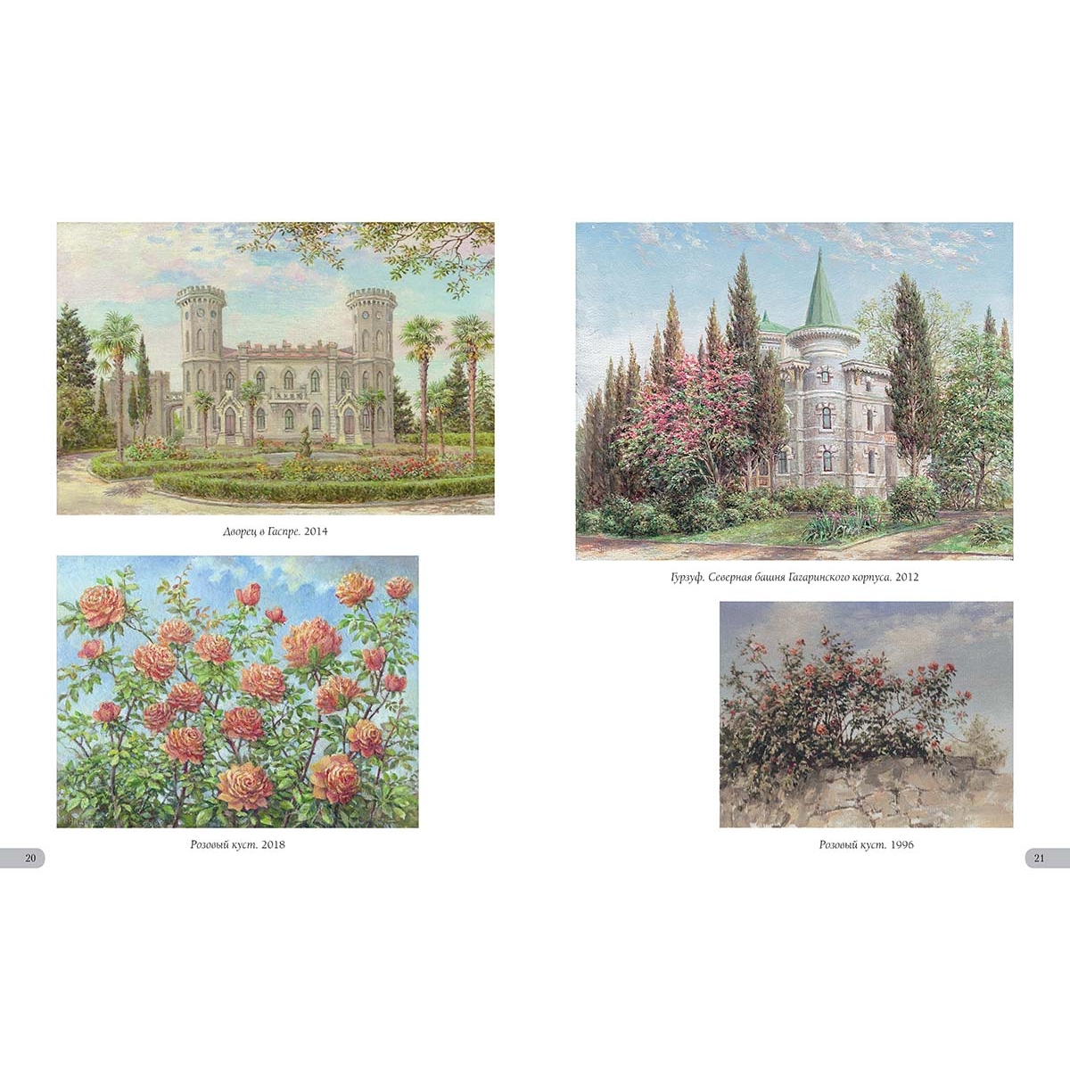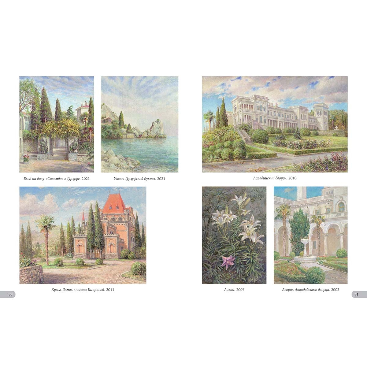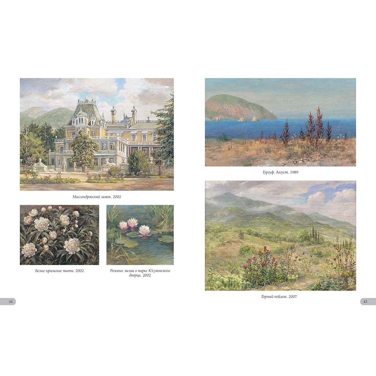 Алупка. Вид на Ай-Петри. 2002 33 Астры. 2010 39 Аю-Даг. 2005 4 Байдарская долина. Вид на Яман-Кола. 2014 37 Балаклава. 2022 40 Бахчисарай. 2018 42 Белая акация. 2012 32 Белеет парус. 2014 29 Белые крымские пионы. 2002 44 Белый олеандр. 2014 6 В Гурзуфском парке. 2013 36 В Чеховской бухте. 2016 28 Весна в Байдарской долине. 2012 43 Весна в Крыму. 1986 7 Ветка белой акации. 2018 13 Ветка граната. 2019 18 Вид на Ливадийский дворец со старинными соснами. 1997 33 Вид на скалы Адалары Гурзуфской бухты. 2019 5 Вид на фонтан «Ночь» и корпус «Парк» в Гурзуфе. 2011 16 Воронцовский дворец в Алупке. 2002 32 Воскресенский храм в Форосе. 2019 15 Вход на дачу «Саламбо» в Гурзуфе. 2021 30 Гагаринский корпус санатория «Гурзуфский». 1989 22 Гибискус. 2005 25 Гладиолусы. 2008 35 Глициния. 1992 39 Гора Авунда. Туман. 1992 22 Горное озеро в Краснокаменке. 2014 14 Горное озеро. Крым. 1995 29 Горный пейзаж. 2007 45 Губонинская библиотека. 2013 18 Губонинский ресторан. 2006 26 Гурзуф. Август. 1989 45 Гурзуф. Глициния у Гагаринского корпуса. 2007 3 Гурзуф. Глициния. Корпус «Ривьера». 2008 13 Гурзуф. Горная дорога. 2009 17 Гурзуф. Корпус «Ривьера». 2008 27 Гурзуф. Северная башня Гагаринского корпуса. 2012 21 Гурзуф. Фонтан «Рахиль». 1994 26 Гурзуфская бухта. Зимородок. 1996 5 Дача Ксения в Семеизе. 2015 39 Дача Стахеева «Отрада» в Алуште. 2019 19 Дача Чехова в Ялте. 2020 34 Дворец в Гаспре. 2014 20 Дворец Дюльбер в Мисхоре. 2002 16 Дворец Кичкине. 2014 12 Дворец Кузнецова в Форосе. 2017 15 Дворец Суук-Су в Артеке. 2005 6 Дворец эмира Бухарского. 2015 10 Дворик Ливадийского дворца. 2002 31 Девушка Арзы и разбойник Али-Баба. 2020 8 Дом Раевского в Гурзуфе. 1995 38 Дом Ришелье в Гурзуфе. 1994 38 Дом старшего врача губернской земской больницы Н.Н. Бетлинга в Симферополе. 2010 11 Древний Херсонес. 1994 24 Желтые розы. 2003 38 Загородный дворец эмира Бухарского на горе Могаби. 2015 10 Ирисы. 2021 11 Кавалерская звезда (Пассифлора). 2019 19 Каменистый берег. 2004 4 Камни, освещенные солнцем. 1997 23 Кипарисы. 2015 25 Колоннадка в Гурзуфском парке. 2010 13 Крым. Горные цветы. 2013 42 Крым. Гурзуф. Гостиница «Парк». 2002 26 Крым. Гурзуф. Дача Чехова. 2007 34 Крым. Гурзуф. Шаляпинский корпус. 2010 7 Крым. Дворец Карасан в Партените. 2012 14 Крым. Дворец Харакс. 2002 27 Крым. Замок княгини Гагариной. 2011 30 Крым. Ласточкино гнездо. 2011 2 Крым. Черная речка. 2012 17 Крымские виноградники. 2015 16 Крымские ирисы. 2012 28 Крымские лилии. 2002 6 Крымский вид. 2012 15 Крымский закат. 2020 12 Крымский пейзаж. 2015 35 Лев у Воронцовского дворца в Алупке. 2017 32 Лестница Юсуповского дворца. 2002 8 Ливадийский дворец. 2018 31 Лилии. 2007 31 Лунная дорожка. Гурзуф. 2004 25 Мангуп-Кале. 1975 41 Массандровский дворец. Северный фасад. 2017 9 Массандровский замок. 2002 44 Мраморные львы в Гурзуфском парке. 1993 36 Мыс Айя. 2002 46 Нижняя беседка в Никитском ботаническом саду. 2014 12 Олеандр. 2015 13 Освещение. 2018 46 Осень в Крыму. 2018 37 Памятник Нахимову в Севастополе. 1994 24 Панорама Гурзуфской бухты. 2010 4 Перед бурей. Гора Таш-Аран (Сундук-Камень). 1977 43 Причал в Гурзуфе. 2017 7 Пушкинский кипарис. 1996 35 Розовые лилии в парке Юсуповского дворца. 2002 44 Розовый куст в Гурзуфе. 2021 42 Розовый куст на фоне библиотеки Губонина. 2012 18 Розовый куст. 1996 21 Розовый куст. 2018 20 Севастополь. Храм Святого Николая на Северной стороне. 2008 40 Старый орех. 1975 41 Судакская крепость. 2017 11 Татарский дом в деревне Саватка (ныне Россошанка). 1975 41 Увядающие хризантемы. 2007 37 Уголок бухты Чехова. 2015 28 Уголок Гурзуфской бухты. 2021 30 Флоксы. 2000 36 Фонтан «Ночь». Сумерки. 2010 22 Чайка. 2002 4 Чайка. 2018 23 Южная башня Массандровского замка. 2012 9 Юсуповский дворец в Кореизе.