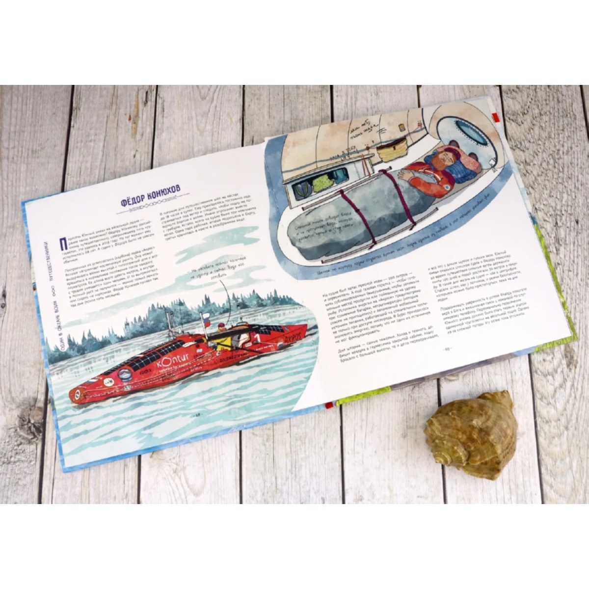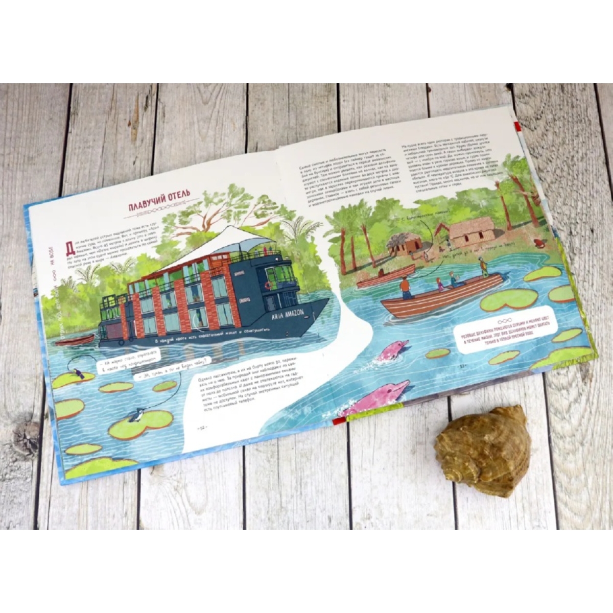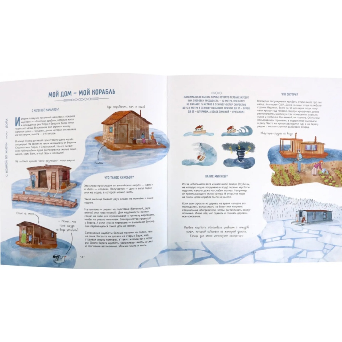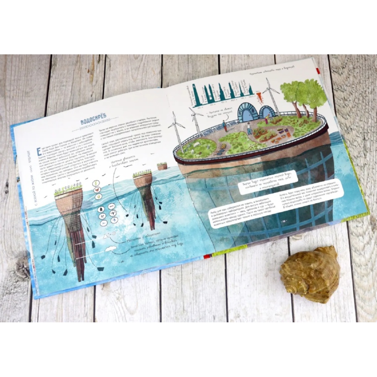 Как вы думаете, кому и зачем пришло в голову жить на воде? Из чего можно построить плавучий дом? Какие правила есть у водной жизни? Давайте проплывём по улицам водных деревень, заглянем на плавучую ферму, перекусим пиццей на дне океана и найдём ответы на эти вопросы. Заодно отдохнём в подводном отеле, покатаемся в автобусе-амфибии, узнаем, как устроена плавучая электростанция, познакомимся со знаменитыми путешественниками, которые в одиночку переплыли океан. А ещё наденем акваланг и посетим подводный музей. Готовы? Тогда открывайте книгу и плывите за нами!